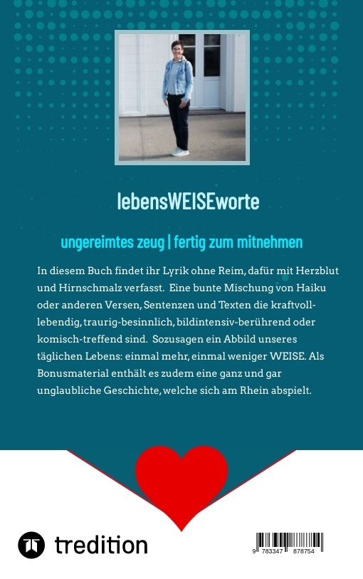 Ihr findet hier Lyrik ohne Reim, dafür mit Herzblut und Hirnschmalz.Eine bunte Mischung von Haikuversen, Sentenzen und Texten die kraftvoll-lebendig, traurig-besinnlich, bildintensiv-berührend oder komisch-treffend sind. Sozusagen ein Abbild unseres täglichen Lebens, einmal mehr, einmal weniger WEISE.