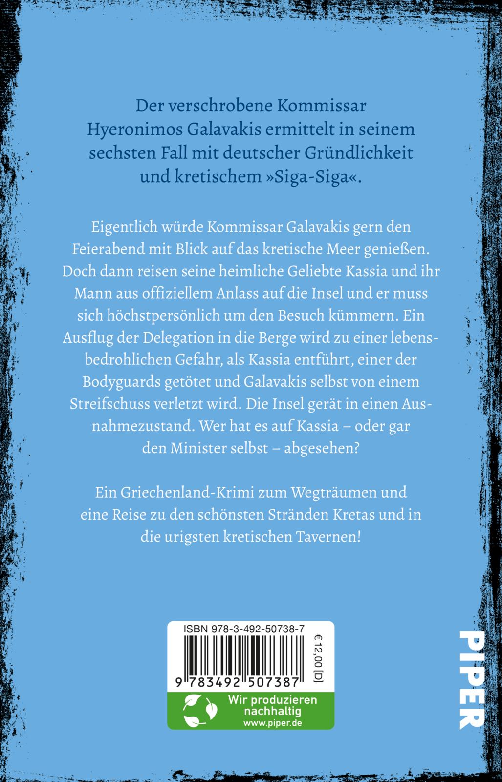 Der verschrobene Kommissar Hyeronimos Galavakis ermittelt in seinem sechsten Fall mit deutscher Gründlichkeit und kretischem »Siga-Siga«. Ein Griechenland-Krimi zum Wegträumen und eine Reise zu den schönsten Stränden und in die urigsten Tavernen Kretas