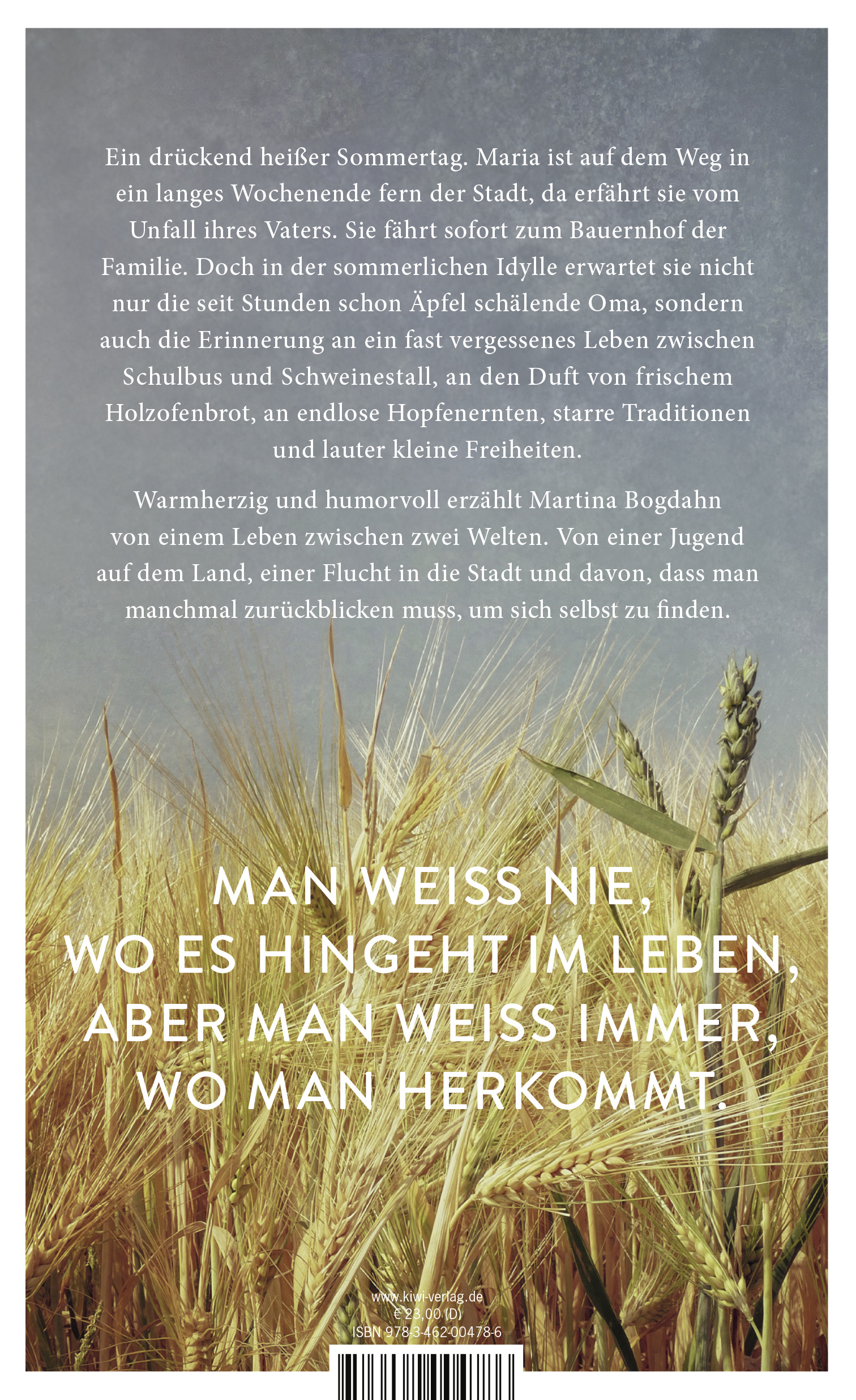 Maria fährt sofort zum Hof. Doch dort, vor der alten Mühle, erwartet sie neben der unermüdlich Äpfel schälenden Oma auch die Erinnerung an ihre Jugend zwischen Schulbus und Schweinestall, Dreimeterbrett und Kirchenbank, an starre Traditionen und lauter kleine Freiheiten.