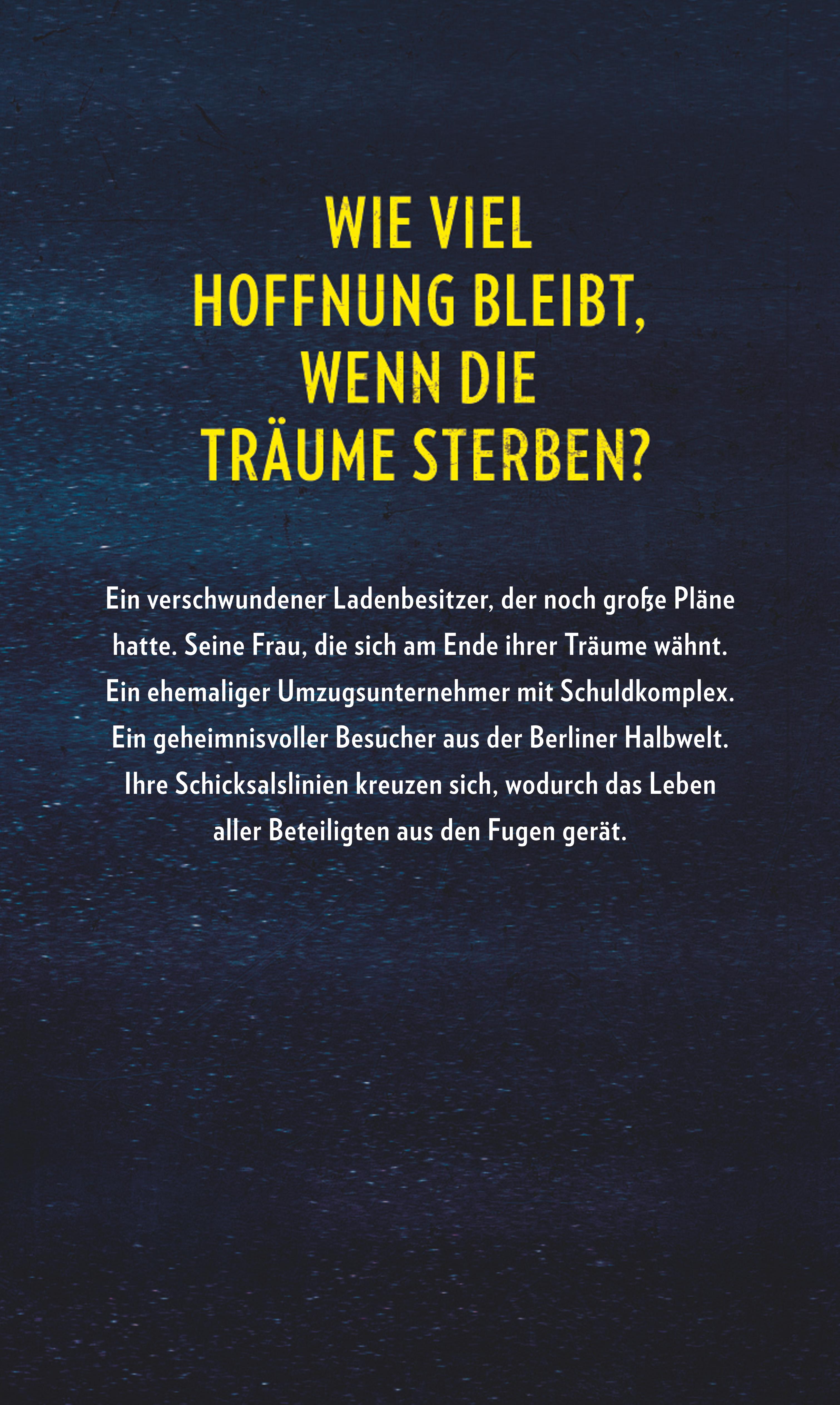 Ein verschwundener Ladenbesitzer, der noch große Pläne hatte. Seine Frau, die sich am Ende ihrer Träume wähnt. Ein ehemaliger Umzugsunternehmer mit Schuldkomplex. Ein geheimnisvoller Besucher aus der Berliner Halbwelt. Ihre Schicksalslinien treffen in München aufeinander, wodurch das Leben aller Beteiligten aus den Fugen gerät.