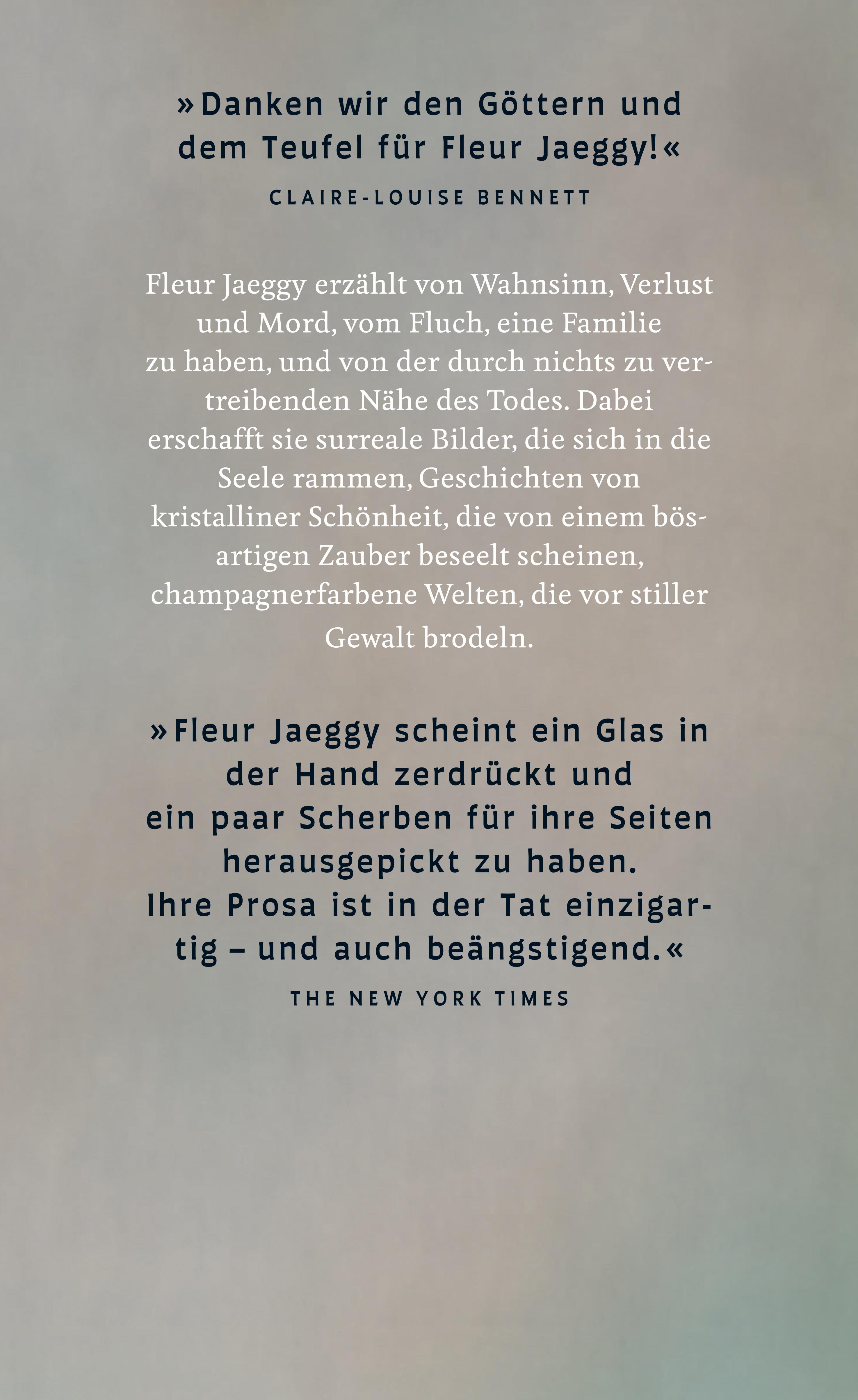 Fleur Jaeggy erzählt von Wahnsinn, Verlust und Mord, vom Fluch, eine Familie zu haben, und von der durch nichts zu vertreibenden Nähe des Todes. Dabei erschafft sie surreale Bilder, die sich in die Seele rammen, Geschichten von kristalliner Schönheit, die von einem bösartigen Zauber beseelt scheinen, champagnerfarbene Welten, die vor stiller Gewalt brodeln.