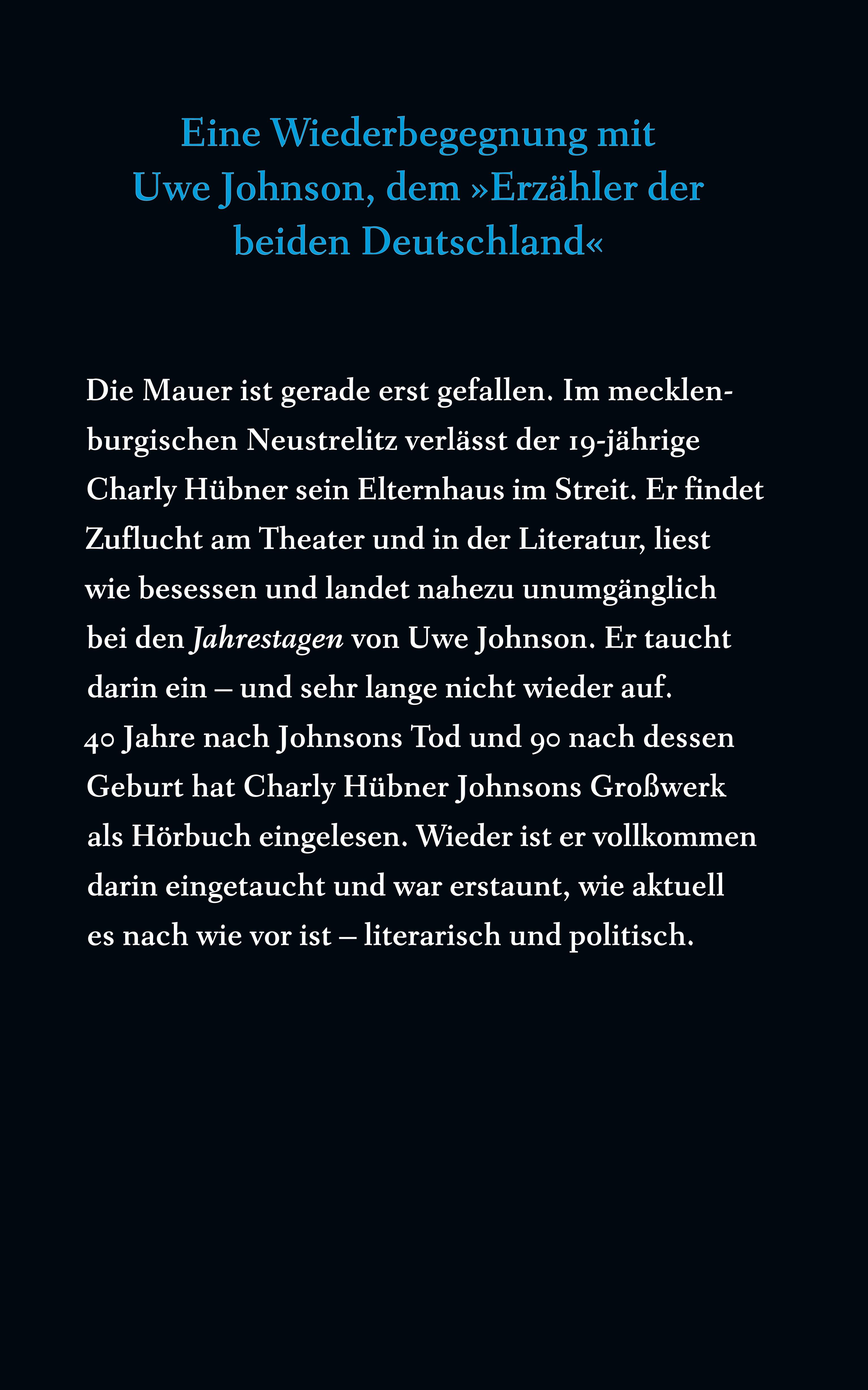 Weltliteratur aus Mecklenburg? Der Gedanke war für den Teenager Charly Hübner neu, unglaubwürdig und explosiv zugleich. Taugte der Landstrich im Süden der Ostsee für die ganz große Story? Er beschloss, dass er taugte. Denn die Jahrestage packten Hübner sofort. Die Fülle, mit der Johnson sein Leben und das seiner Freunde und Freundinnen in ein exemplarisches literarisches Leben verwandelte, mit lässiger, harter, weiser und zarter Hand, entfaltete einen ungeheuren Sog und stellt ihn für Hübner bis heute in eine Reihe mit jenen großen Autorinnen und Autoren, die aus Anekdoten Epoche machen und für immer gegenwärtig bleiben.