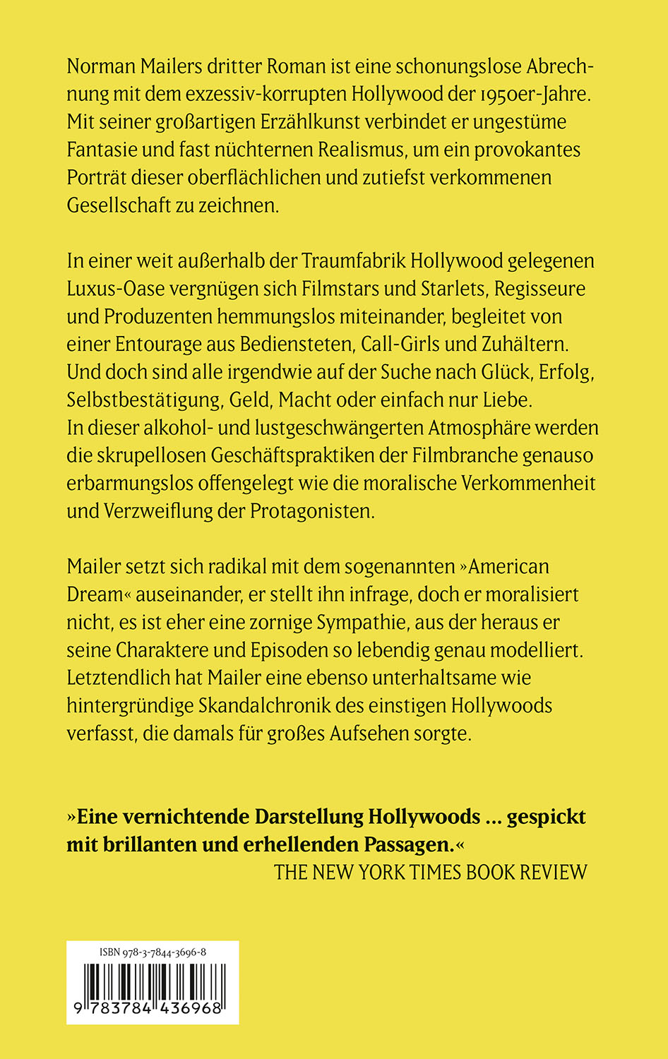 Norman Mailers dritter Roman ist eine mitreißende und schonungslos offene Satire auf das exzessive und verlogene Hollywood der 1950er Jahre. Mailers Erzählkunst verbindet ungestüme Fantasie mit fast dokumentarischem Realismus, um ein kompromisslos verstörendes Porträt einer zutiefst verkommenen Gesellschaft zu zeichnen. Mailer setzt sich radikal mit dem »American Dream« auseinander, er stellt ihn infrage, seine Werte, seine Wege zum Erfolg. Doch er moralisiert nicht, es ist eher eine zornige Sympathie, aus der heraus er seine Charaktere und Episoden so lebendig genau modelliert. Er verfasst letztendlich eine ebenso unterhaltsame wie hintergründige Skandalchronik der vergangenen Hollywood-Filmwelt.