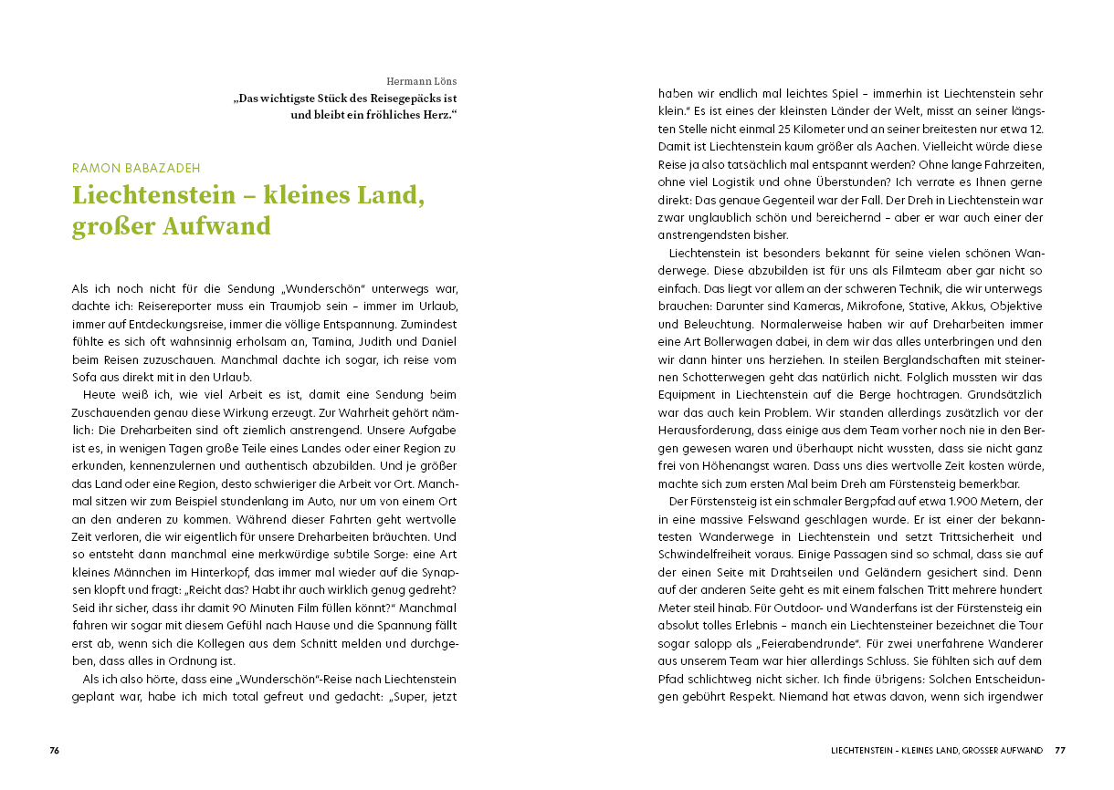 Das alles macht die TV-Sendung »Wunderschön« aus und dieses sehr empfehlenswerte Buch. Denn die Autoren erzählen, was hinter den Kulissen der Dreharbeiten so alles passiert.