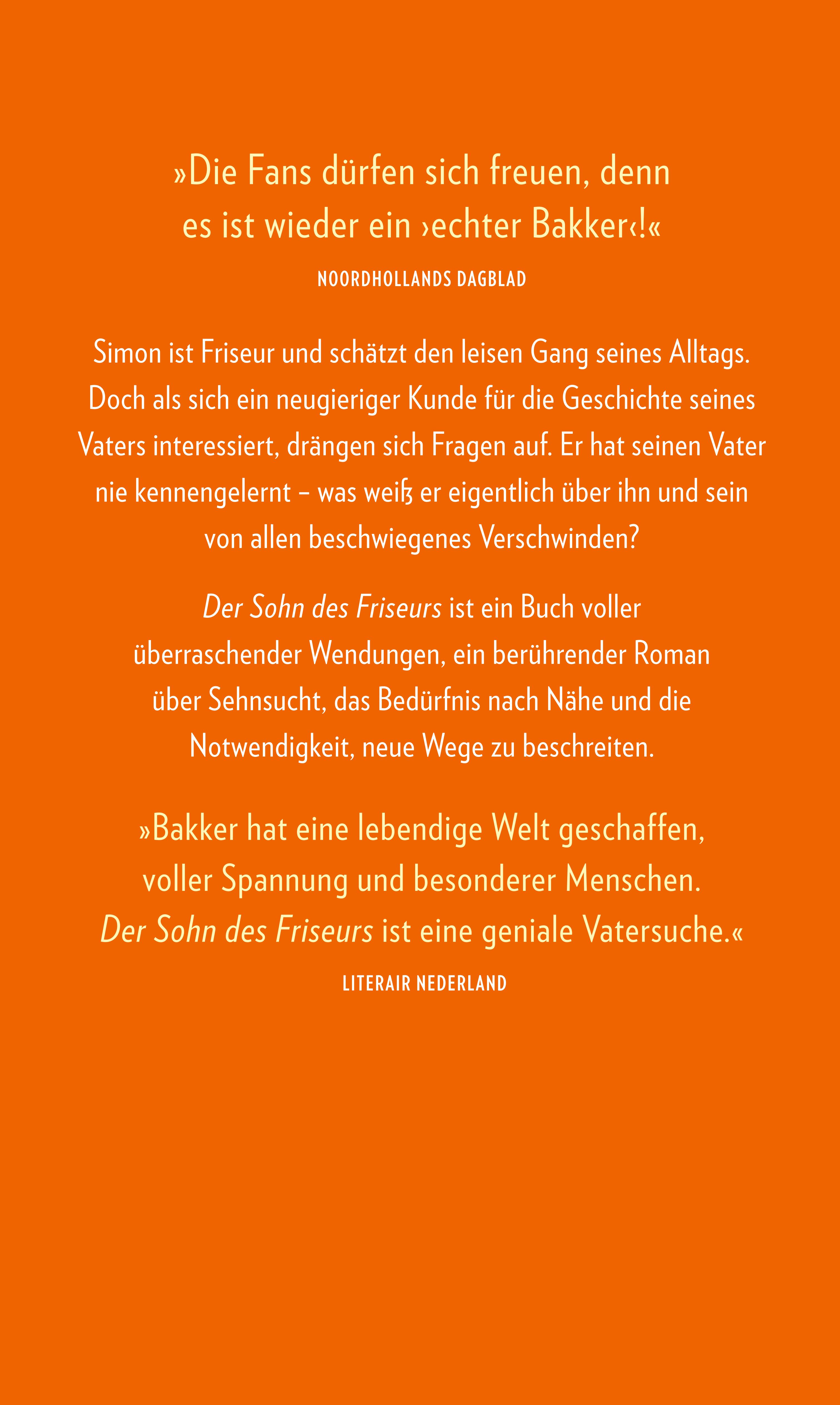 In überraschenden Wendungen erzählt Bakker von einem Mann, dessen Leben wider seinen Willen Fahrt aufnimmt. Der Sohn des Friseurs ist ein berührender Roman über Sehnsucht, das Bedürfnis nach Nähe und die Notwendigkeit, die Grenzen des Bekannten zu durchbrechen.