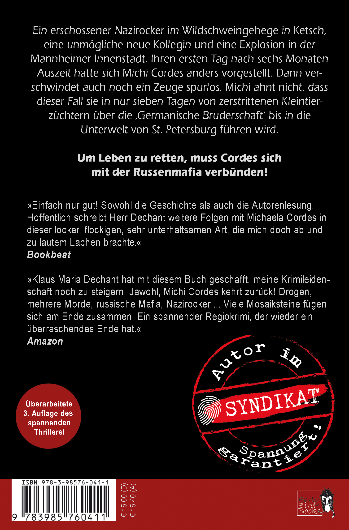 Ein erschossener Nazirocker im Wildschweingehege in Ketsch, eine unmögliche neue Kollegin und eine Explosion in der Mannheimer Innenstadt. Ihren ersten Tag nach sechs Monaten Auszeit hatte sich Michi Cordes anders vorgestellt. Dann verschwindet auch noch ein Zeuge spurlos. Michi ahnt nicht, dass dieser Fall sie in nur sieben Tagen von zerstrittenen Kleintierzüchtern über die ‚Germanische Bruderschaft‘ bis in die Unterwelt von St. Petersburg führen wird.