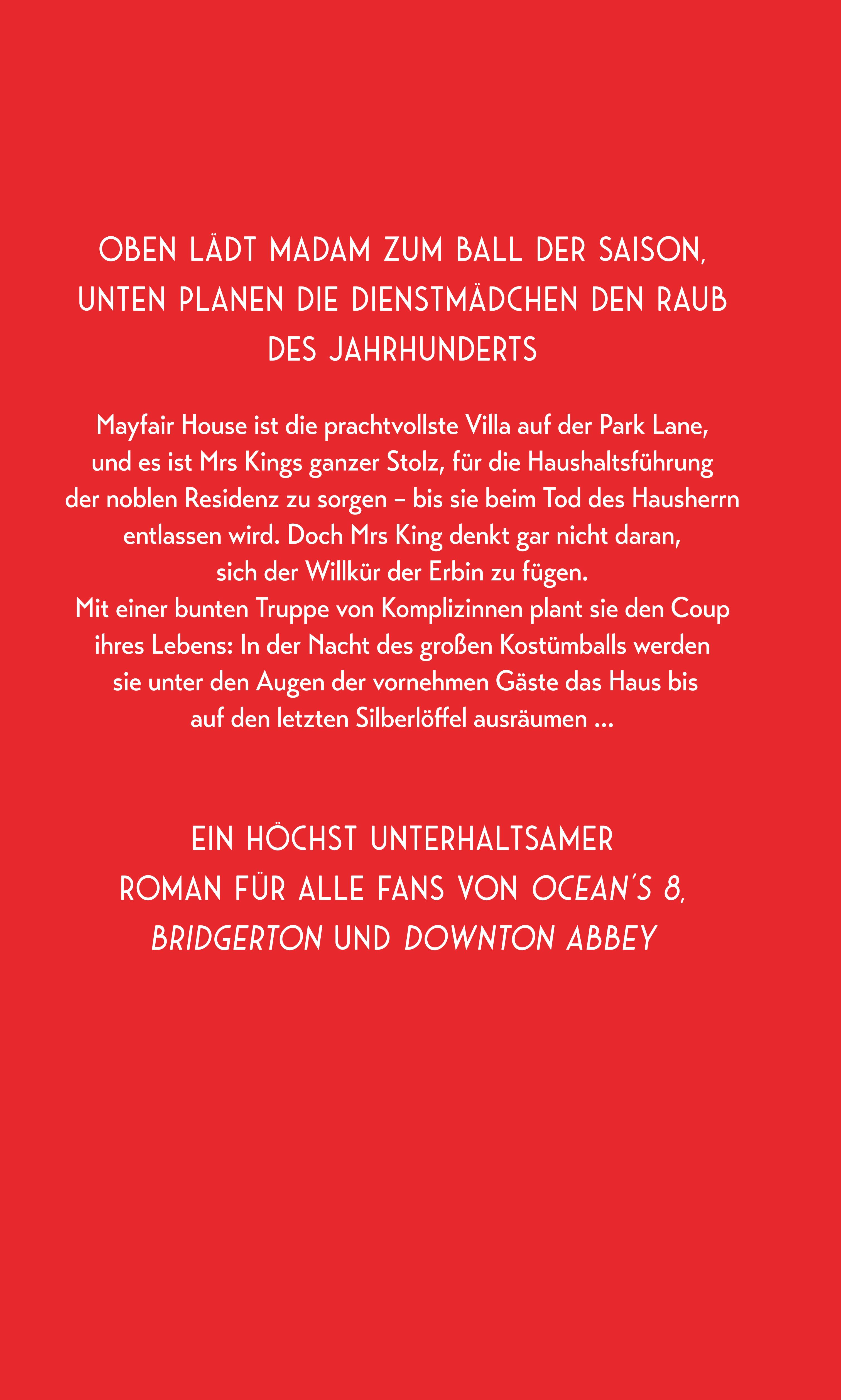 London, Mayfair 1905: Die Villa der Familie de Vries ist die prachtvollste auf der Park Lane, außen weißer Marmor, innen kostbare Möbel, funkelnde Kronleuchter, Kristallschalen und edle Kunstgegenstände, Silber und Gold glänzen um die Wette. Es ist Mrs Kings ganzer Stolz, für die exzellente Haushaltsführung der noblen Residenz zu sorgen - bis sie beim Tod des Hausherrn nach Jahren treuer Dienste kurzerhand entlassen wird. Doch Mrs King denkt gar nicht daran, sich der Willkür der Erbin de Vries zu fügen. Sie will nur eins - Gerechtigkeit.