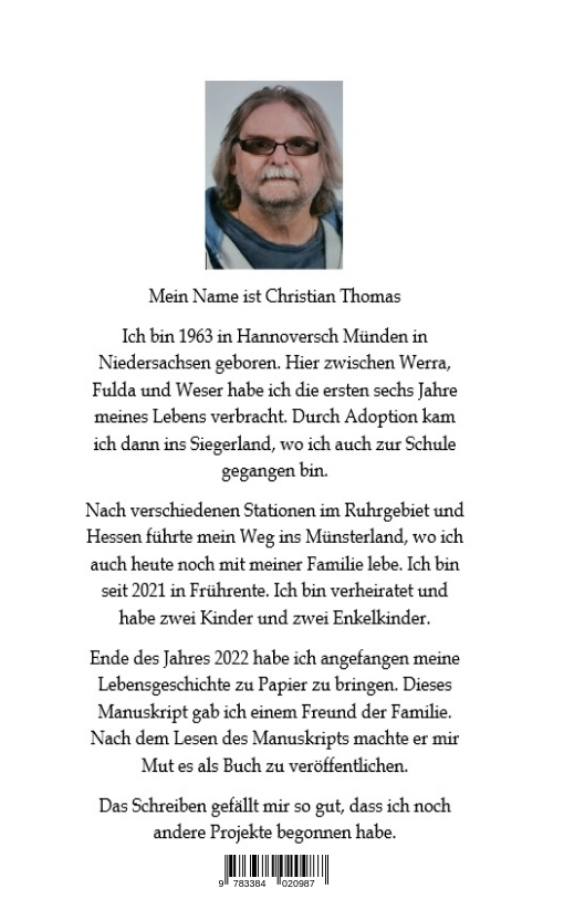 Christian Thomas wurde am 17.08.1963 in Hannoversch Münden in Niedersachsen geboren und wuchs im Siegerland auf. Vor der Frührente hat er zuletzt als IT-Systemelektroniker und EDV-Sachverständiger gearbeitet. Christian Thomas wohnt in Coesfeld im Münsterland. Er ist verheiratet und hat 2 Kinder und 2 Enkelkinder. Seit 2021 befindet er sich in Frührente und fing 2022 an, Bücher zu schreiben. Sein erstes Buch „… wir haben ihn nie gewollt! Die Lebensgeschichte eines Adoptivkindes“ kam im Mai 2023 heraus. Es beschreibt seine eigene Kindheit und Jugend! Ein Muss für jeden, der die dunklere Seite von Adoption kennenlernen möchte! Nicht immer führt eine Adoption bei einem Kind zu einem besseren Leben. Das Buch „Kriminalhauptkommissar Geiger, Ein Hauch von Vanille“ ist das erste einer Reihe von Krimis mit Kriminalhauptkommissar Manfred Geiger, Leiter einer Sonderkommission (SoKo) bei der Kriminalpolizei Frankfurt. Die SoKo muss den Mord an einer weltbekannten Influencerin aufklären! Nicht immer ist alles so, wie es scheint!