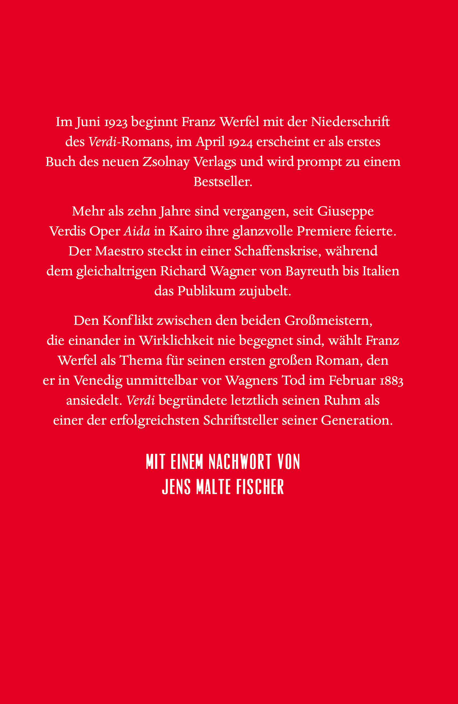 Seine Leidenschaft für das Südliche, für Italien, seine Verachtung für das kühle Nördliche lässt Werfel in diesem Künstlerroman, den er innerhalb weniger Monate 1923/24 niederschreibt, deutlich spüren. "Verdi" begründete letztlich seinen Ruhm als einer der erfolgreichsten Schriftsteller seiner Generation. Im April 1924 erscheint es als erstes Buch des neuen Zsolnay Verlags und wird prompt zu einem Bestseller.