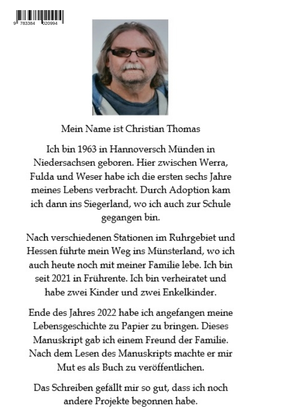Christian Thomas wurde am 17.08.1963 in Hannoversch Münden in Niedersachsen geboren und wuchs im Siegerland auf. Vor der Frührente hat er zuletzt als IT-Systemelektroniker und EDV-Sachverständiger gearbeitet. Christian Thomas wohnt in Coesfeld im Münsterland. Er ist verheiratet und hat 2 Kinder und 2 Enkelkinder. Seit 2021 befindet er sich in Frührente und fing 2022 an, Bücher zu schreiben. Sein erstes Buch „… wir haben ihn nie gewollt! Die Lebensgeschichte eines Adoptivkindes“ kam im Mai 2023 heraus. Es beschreibt seine eigene Kindheit und Jugend! Ein Muss für jeden, der die dunklere Seite von Adoption kennenlernen möchte! Nicht immer führt eine Adoption bei einem Kind zu einem besseren Leben. Das Buch „Kriminalhauptkommissar Geiger, Ein Hauch von Vanille“ ist das erste einer Reihe von Krimis mit Kriminalhauptkommissar Manfred Geiger, Leiter einer Sonderkommission (SoKo) bei der Kriminalpolizei Frankfurt. Die SoKo muss den Mord an einer weltbekannten Influencerin aufklären! Nicht immer ist alles so, wie es scheint!