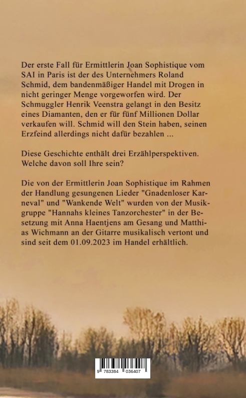 Der erste Fall für Ermittlerin Joan Sophistique vom SAI in Paris ist der des Unternehmers Roland Schmid, dem bandenmäßiger Handel mit Drogen in nicht geringer Menge vorgeworfen wird. Der Schmuggler Henrik Veenstra gelangt in den Besitz eines Diamanten, den er für fünf Millionen Dollar verkaufen will. Schmid will den Stein haben, seinen Erzfeind allerdings nicht dafür bezahlen ...Diese Geschichte enthält drei Erzählperspektiven. Welche davon soll Ihre sein?Die von der Ermittlerin Joan Sophistique im Rahmen der Handlung gesungenen Lieder "Gnadenloser Karneval" und "Wankende Welt" wurden von der Musikgruppe "Hannahs kleines Tanzorchester" in der Besetzung mit Anna Haentjens am Gesang und Matthias Wichmann an der Gitarre musikalisch vertont und sind im Handel erhältlich.