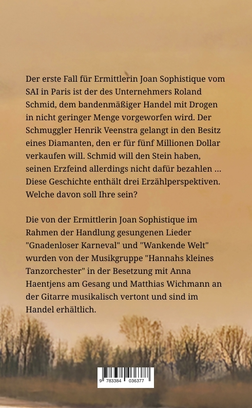 Der erste Fall für Ermittlerin Joan Sophistique vom SAI in Paris ist der des Unternehmers Roland Schmid, dem bandenmäßiger Handel mit Drogen in nicht geringer Menge vorgeworfen wird. Der Schmuggler Henrik Veenstra gelangt in den Besitz eines Diamanten, den er für fünf Millionen Dollar verkaufen will. Schmid will den Stein haben, seinen Erzfeind allerdings nicht dafür bezahlen ...Diese Geschichte enthält drei Erzählperspektiven. Welche davon soll Ihre sein?Die von der Ermittlerin Joan Sophistique im Rahmen der Handlung gesungenen Lieder "Gnadenloser Karneval" und "Wankende Welt" wurden von der Musikgruppe "Hannahs kleines Tanzorchester" in der Besetzung mit Anna Haentjens am Gesang und Matthias Wichmann an der Gitarre musikalisch vertont und sind im Handel erhältlich.