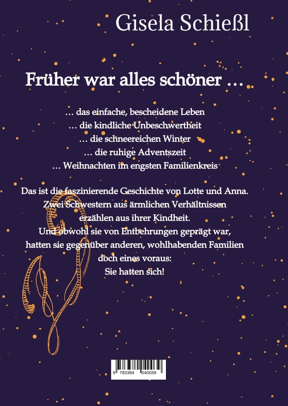 Früher war alles schöner ...... das einfache, bescheidene Leben... die kindliche Unbeschwertheit... die schneereichen Winter... die ruhige Adventszeit... Weihnachten im engsten FamilienkreisDas ist die faszinierende Geschichte von Lotte und Anna.Zwei Schwestern aus ärmlichen Verhältnissen erzählen aus ihrer Kindheit.Und obwohl sie von Entbehrungen geprägt war, hatten sie gegenüber anderen, wohlhabenden Familien doch eines voraus:Sie hatten sich!