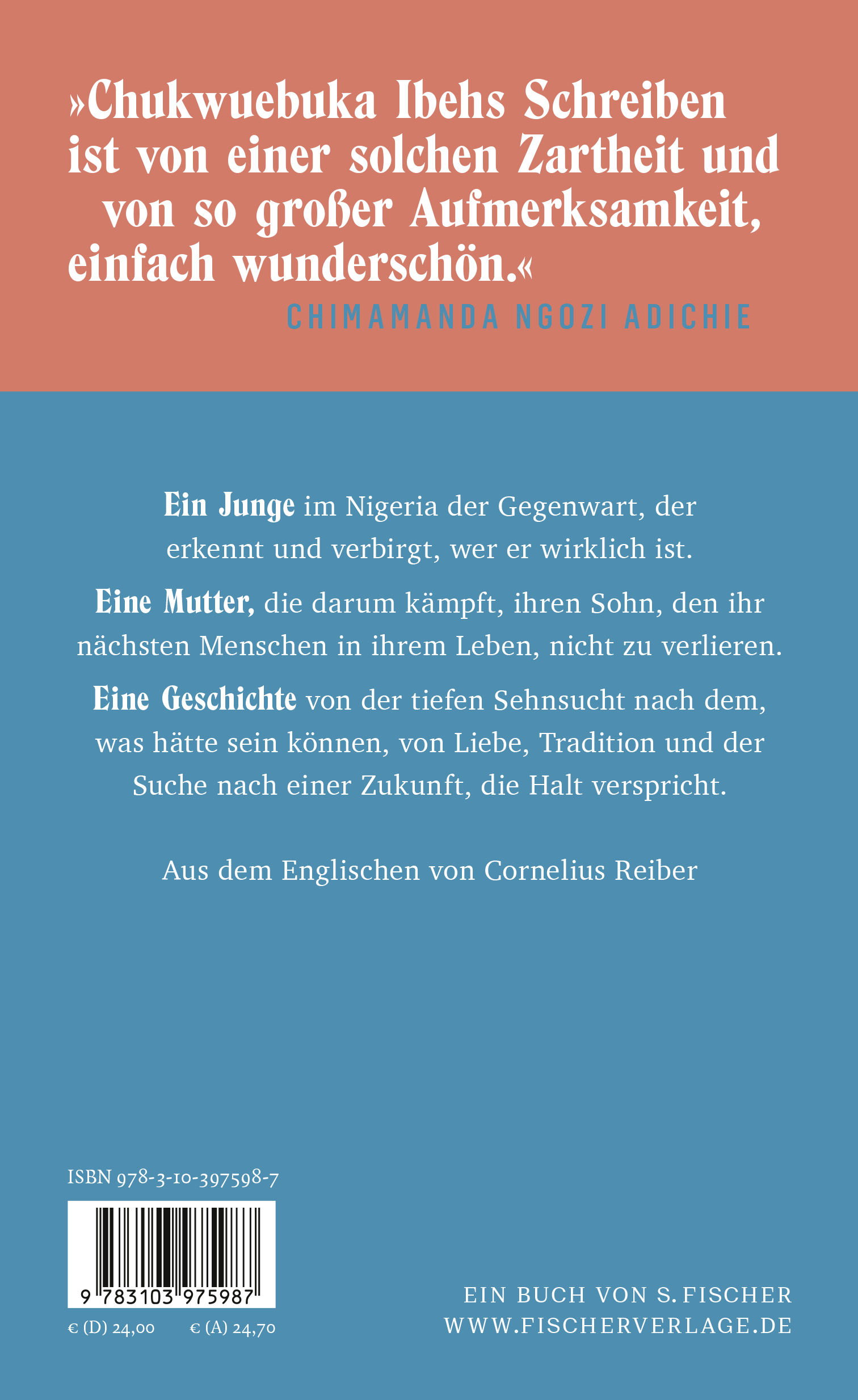 | Schlagworte | Ablehnung • Anspruchsvolle Literatur • Aufwachsen • Bücher über LGBTQ Erfahrungen in Afrika • Coming-of-Age Roman Nigeria • Diskriminierung • Ein Buch von S. Fischer • Einsamkeit • Gewalterfahrung • Homosexualitität • Internat • Liebe • Nigeria • Religion • Romane über persönliche Freiheit und Politik • Schuld • Strenge • Verbundenheit • Verlangen • Wunsch nach Dazugehörigkeit |