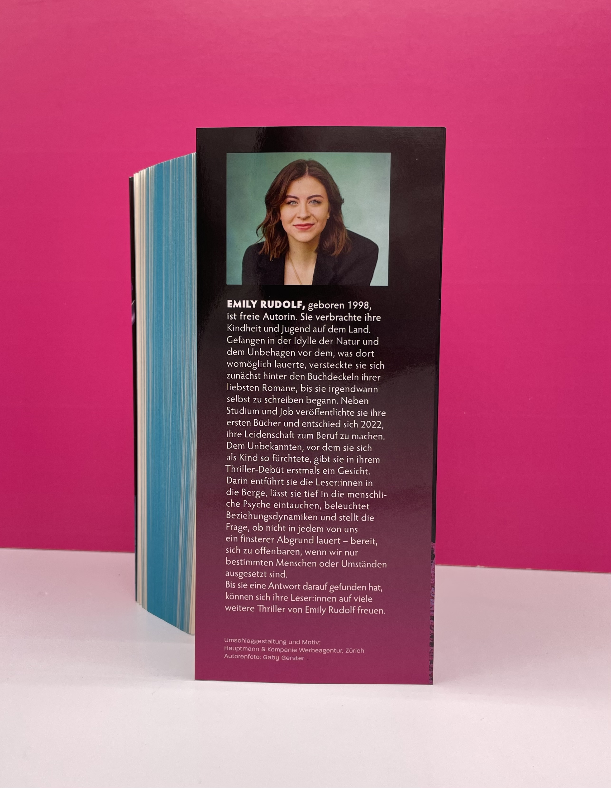 Emily Rudolf, geboren 1998, ist freie Autorin. Sie verbrachte ihre Kindheit und Jugend auf dem Land. Gefangen in der Idylle der Natur und dem Unbehagen vor dem, was dort womöglich lauerte, versteckte sie sich zunächst hinter den Buchdeckeln ihrer liebsten Romane, bis sie irgendwann selbst zu schreiben begann. Neben Studium und Job veröffentlichte sie ihre ersten Bücher und entschied sich 2022, ihre Leidenschaft zum Beruf zu machen. Dem Unbekannten, vor dem sie sich als Kind so fürchtete, gibt sie in ihrem Thriller-Debüt erstmals ein Gesicht. Darin entführt sie die Leser:innen in die Berge, lässt sie tief in die menschliche Psyche eintauchen, beleuchtet Beziehungsdynamiken und stellt die Frage, ob nicht in jedem von uns ein finsterer Abgrund lauert – bereit, sich zu offenbaren, wenn wir nur bestimmten Menschen oder Umständen ausgesetzt sind. Bis sie eine Antwort darauf gefunden hat, können sich ihre Leser:innen auf viele weitere Thriller von Emily Rudolf freuen.