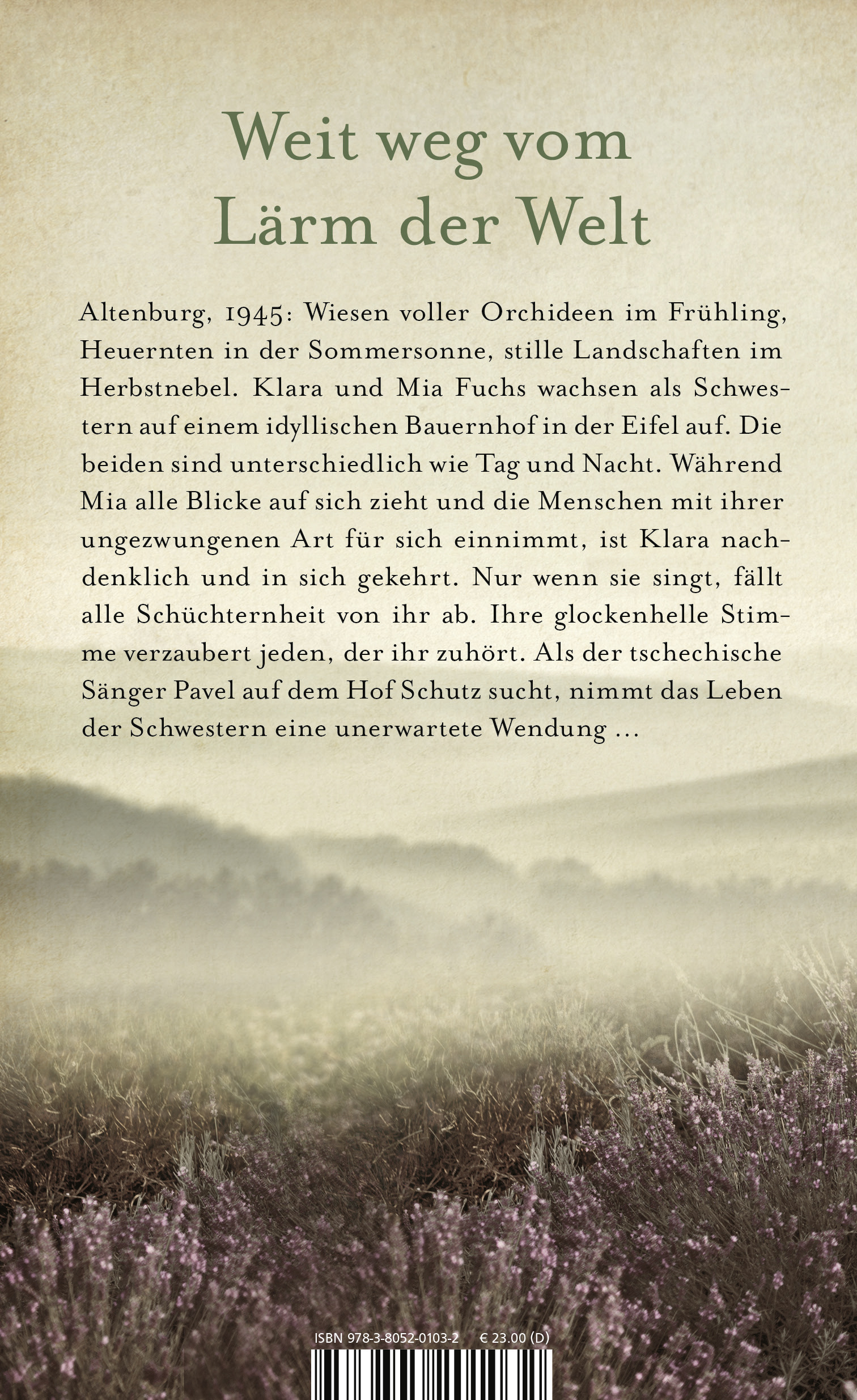 Altenburg, 1945: Wiesen voller Orchideen im Frühling, Heuernten in der Sommersonne, stille Landschaften im Herbstnebel. Klara und Mia Fuchs wachsen als Schwestern auf einem idyllischen Bauernhof in der Eifel auf. Die beiden sind unterschiedlich wie Tag und Nacht: Während Mia alle Blicke auf sich zieht und die Menschen mit ihrer ungezwungenen Art für sich einnimmt, ist Klara nachdenklich und in sich gekehrt. Nur wenn sie singt, fällt alle Schüchternheit von ihr ab. Ihre glockenhelle Stimme verzaubert jeden, der ihr zuhört. Als der tschechische Sänger Pavel auf dem Hof Schutz sucht, nimmt das Leben der Schwestern eine unerwartete Wendung ...