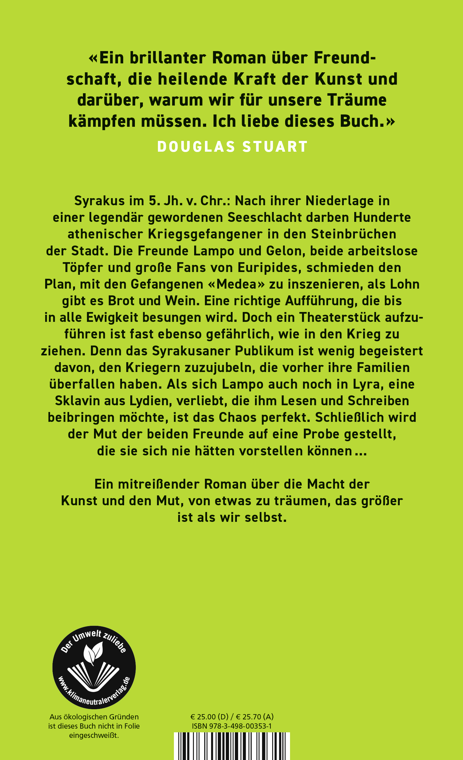 Syrakus im 5. Jh. v. Chr.: Nach ihrer Niederlage in einer legendär gewordenen Seeschlacht darben Hunderte athenischer Kriegsgefangener in den Steinbrüchen der Stadt. Die Freunde Lampo und Gelon, beide arbeitslose Töpfer und große Fans von Euripides, schmieden den Plan, mit den Gefangenen «Medea» zu inszenieren, als Lohn gibt es Brot und Wein. Eine richtige Aufführung, die bis in alle Ewigkeit besungen wird. Doch ein Theaterstück aufzuführen ist fast ebenso gefährlich, wie in den Krieg zu ziehen. Denn das Syrakuser Publikum ist wenig begeistert davon, den Kriegern zuzujubeln, die vorher ihre Familien überfallen haben. Als sich Lampo auch noch in Lyra, eine Sklavin aus Lydien, verliebt, die ihm Lesen und Schreiben beibringen möchte, ist das Chaos perfekt. Schließlich wird der Mut der beiden Freunde auf eine Probe gestellt, die sie sich nie hätten vorstellen können ...