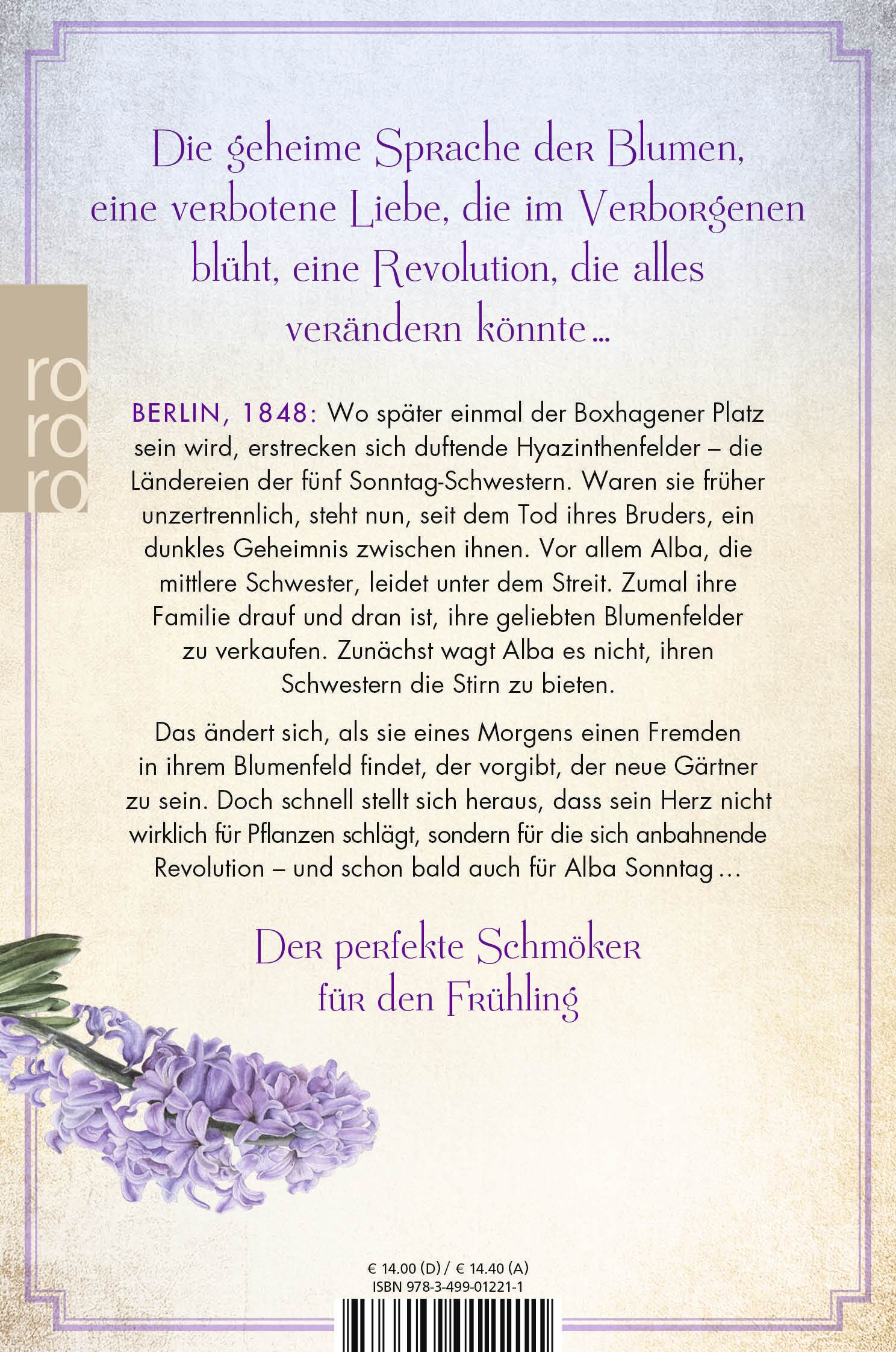 Berlin, 1848: Wo später einmal der Boxhagener Platz sein wird, erstrecken sich duftende Hyazinthenfelder, so weit das Auge reicht - die Ländereien der fünf Sonntag-Schwestern. Früher waren sie unzertrennlich, doch seit dem Tod ihres Bruders Heinrich steht ein dunkles Geheimnis zwischen ihnen. Vor allem die mittlere Schwester Alba leidet sehr unter dem großen Streit. Zumal ihre Familie drauf und dran ist, die Felder zu verkaufen, die Alba über alles liebt. In der Sprache der Blumen, die ihre Mutter sie gelehrt hat, versucht sie, mit ihren Schwestern Frieden zu schließen und für den Erhalt von Boxhagen zu kämpfen. Bis eines Morgens ein Fremder in ihrem Blumenbeet liegt, der vorgibt, der neue Gärtner zu sein. Hals über Kopf verliebt sie sich in ihn, ohne zu ahnen, dass in seiner Brust das Herz eines Revolutionärs schlägt, der bereits den Aufstand plant. Ihre Liebe verändert Albas Blick auf die Welt, sodass sie nicht nur Mut fasst, für eine bessere Zukunft zu kämpfen, sondern auch, sich der düsteren Vergangenheit ihrer Familie zu stellen.