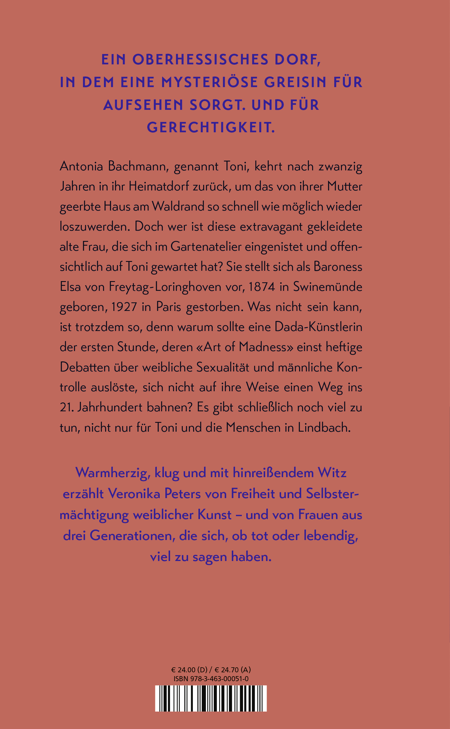 In Veronika Peters neuem Roman Nackt war ich am schönsten kehrt Antonia Bachmann, genannt Toni, aus der Bretagne in ihr oberhessisches Heimatdorf zurück, nachdem sie das alte Haus ihrer Mutter am Waldrand geerbt hat. Das Verhältnis zur Mutter war angespannt, Toni taucht erst zwei Wochen nach der Beerdigung in Lindbach auf, mit dem Ziel, das Haus schnellstmöglich loszuwerden. Doch wer ist diese extravagant gekleidete alte Frau, die sich im Gartenatelier eingerichtet und offensichtlich auf Toni gewartet hat? Sie stellt sich als Baroness Elsa von Freytag-Loringhoven vor, eine exzentrische Dada-Künstlerin, die einst heftige Debatten über weibliche Selbstermächtigung auslöste.