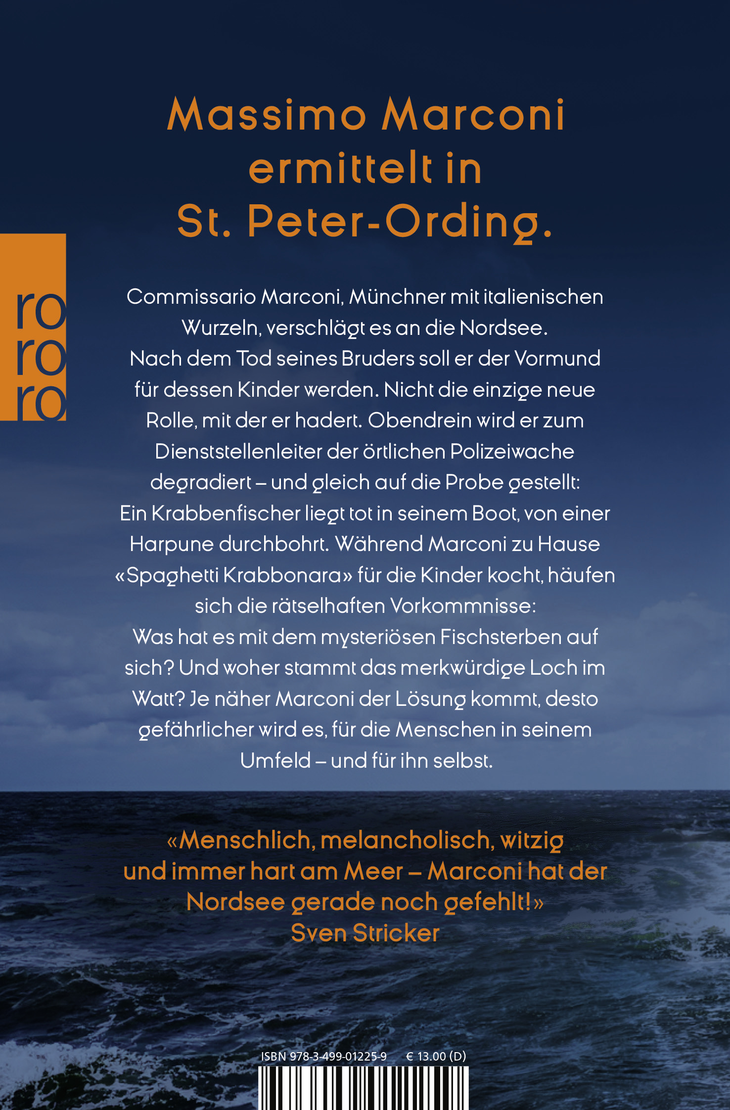 Commissario Marconi, Münchner mit italienischen Wurzeln, verschlägt es an die Nordsee - nach St. Peter Ording. Nach dem Tod seines Bruders ist er der Vormund für dessen Kinder Klara und Stefano. Mit seinem Umzug zu den reservierten Nordfriesen, denen Marconi nicht viel abgewinnen kann, wird er zum Dienststellenleiter der örtlichen Polizeiwache degradiert - und gleich auf die Probe gestellt: Ein toter Krabbenfischer, in seinem Boot von einer Harpune durchbohrt. Eigentlich Sache der Kripo Flensburg, aber da sonst nichts zu tun ist ... Mit seinen Kollegen, dem regeltreuen Jens und der resoluten Eva, nimmt Marconi die Ermittlungen auf, während er zu Hause «Spaghetti Krabbonara» für die Kinder kocht und sich mit dem Jugendamt herumschlägt. Dabei ist mit mehreren heißen Fährten im Mordfall schon genug zu tun: Hat Elektrofischer Henning Voss den Toten auf dem Gewissen, weil er ihm ins Gehege kam? Oder hat eine Umweltschutzorganisation ihre Finger im Spiel, der die Schleppnetzfischerei gegen den Strich geht?