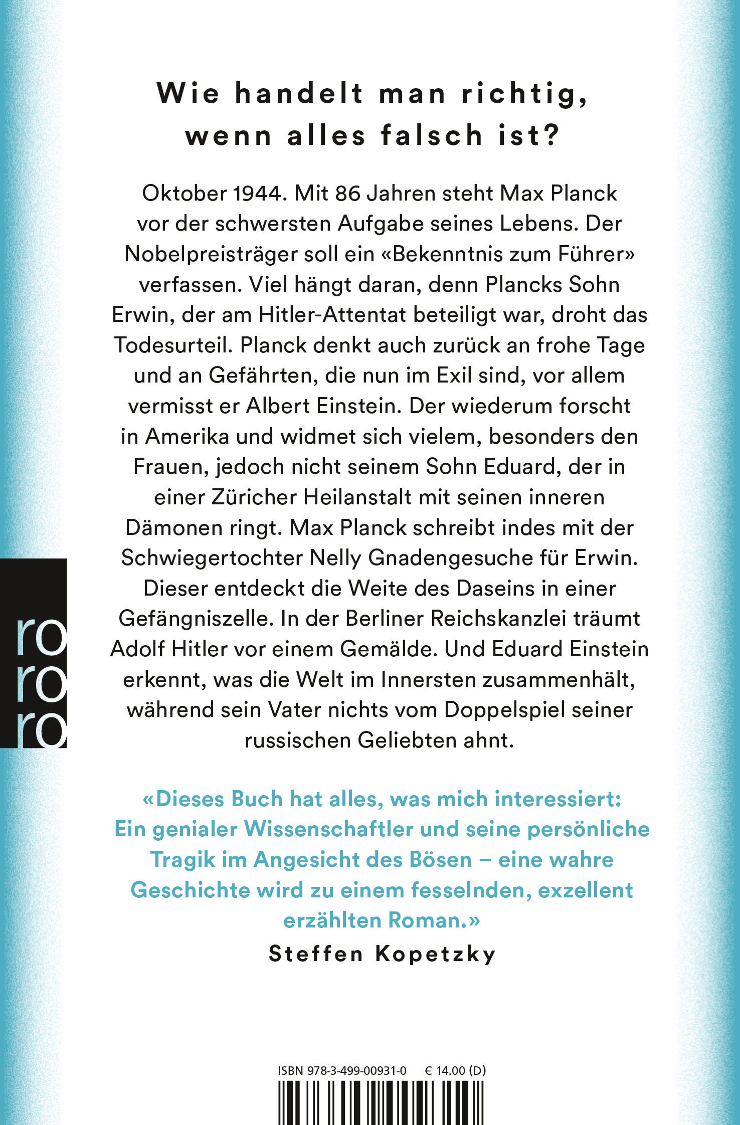 Oktober 1944. Mit 86 Jahren steht Max Planck vor der schwersten Aufgabe seines Lebens. Der Nobelpreisträger soll ein «Bekenntnis zum Führer» verfassen. Viel hängt daran, denn Plancks Sohn Erwin, der am Hitler-Attentat beteiligt war, sitzt im Todestrakt von Tegel. Planck denkt zurück an frohe Tage und an Gefährten, die nun im Exil sind, vor allem vermisst er Albert Einstein. Der forscht in Amerika und widmet sich vielem, besonders den Frauen, jedoch nicht seinem Sohn Eduard, der in einer Züricher Heilanstalt mit seinen inneren Dämonen ringt. Max Planck schreibt mit der Schwiegertochter Nelly Gnadengesuche für Erwin; dieser entdeckt die Weite des Daseins in einer Gefängniszelle. In der Berliner Reichskanzlei träumt Adolf Hitler vor einem Gemälde. Und Eduard Einstein erkennt, was die Welt im Innersten zusammenhält, während sein Vater nichts vom Doppelspiel seiner russischen Geliebten ahnt.