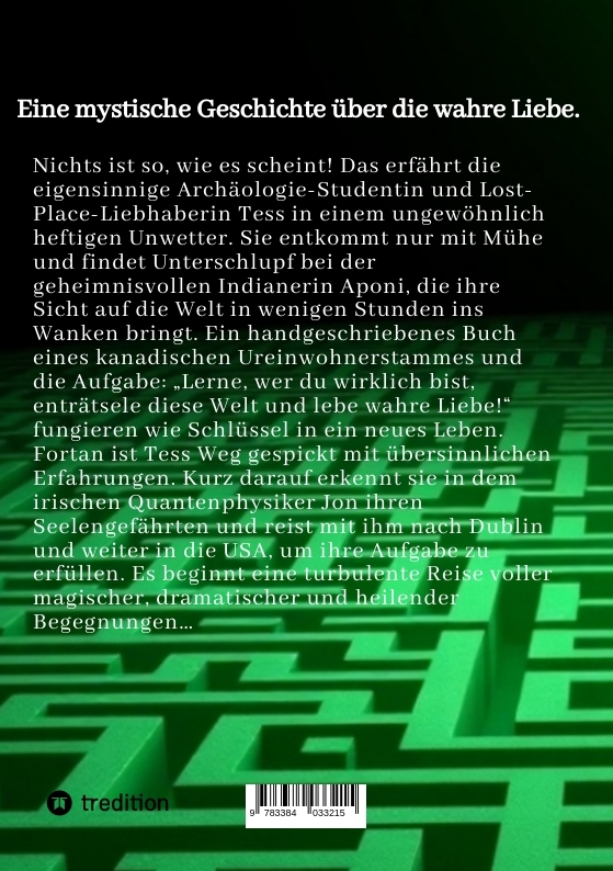 | Schlagworte | Abenteuer • Agape • Drreiecksbeziehung • Dualseelen • Einheit • Einssein • Erleuchtung • Erwachen • finden • Frau • Gedanken • geistiges Erwachen • Geschichte • Gott • Große Liebe • Heiliger Augenblick • Herz • Jahre • Labyrinth • Liebe • Liebesgeschichte • Liebesroman • Lovestory • Magie • Mann • Menschen • Moment • Mystik • Paar • Roadtrip • Romantik • Seelenliebe • Selbstfindung • Selbstliebe • SPIRIT • Spiritualität • surreal • Übersinnlich • Übersinnlichkeit • Welt • Wissen • Zwillingsseelen |