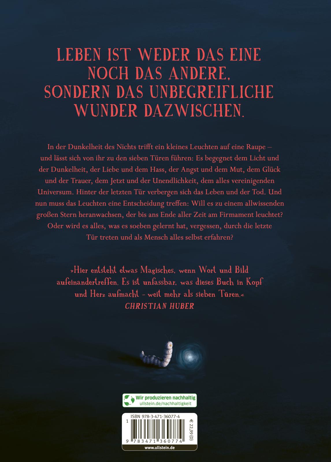 Die sieben Türen beginnt mit einem Leuchten. Es findet sich im Nichts wieder, in der endlosen Dunkelheit. Allein. Bis sich eine kleine Raupe dazugesellt, die das Leuchten zu sieben Türen führt. Hinter jede dieser Türen darf es kurz blicken - es verbergen sich die größten Polaritäten dieses Universums dahinter. Das Leuchten begegnet nacheinander dem Licht und der Dunkelheit, der Liebe und dem Hass, der Angst und dem Mut, dem Glück und der Trauer, dem Jetzt und der Unendlichkeit und dem großen, alles vereinigenden Universum und dem Nichts. Hinter der letzten Tür verbergen sich das Leben und der Tod. Und nun muss das Leuchten eine Entscheidung treffen: Will es zu einem allwissenden großen Stern heranwachsen, der bis ans Ende aller Zeit am Firmament leuchtet? Oder wird es alles, was es soeben gelernt hat, vergessen, durch die letzte Tür treten und als Mensch alles selbst erfahren?