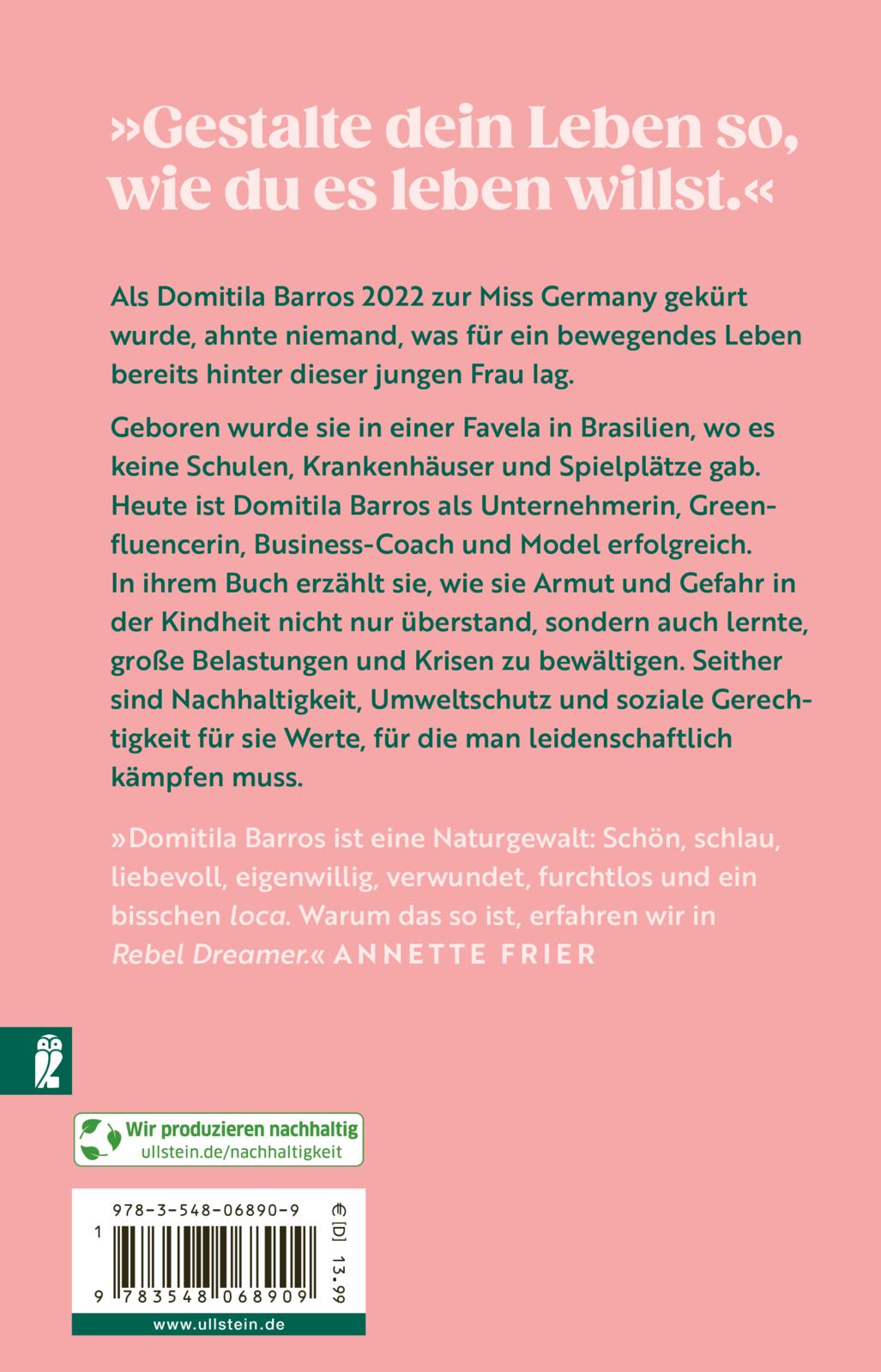 Domitila Barros arbeitet heute als Unternehmerin, Greenfluencerin, Business-Coach und Model. In ihrem Buch erzählt sie, wie sie Armut und Gefahr in der Kindheit und Jugend nicht nur überstand, sondern dadurch lernte, mit großen Belastungen umzugehen und Krisen zu bewältigen. Seither sind Herausforderungen wie Nachhaltigkeit, Umweltschutz und soziale Gerechtigkeit für sie Werte, für die man leidenschaftlich kämpfen muss.