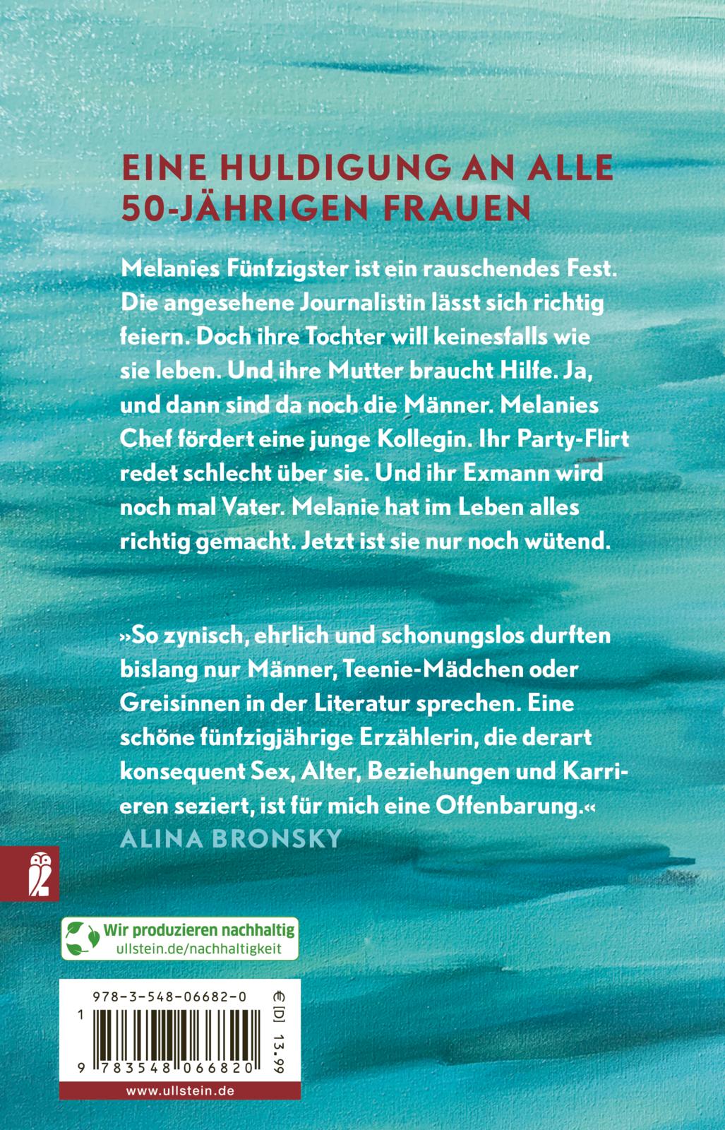 Melanies Fünfzigster ist ein rauschendes Fest. Die angesehene Journalistin lässt sich - wie schon so oft - ganz groß feiern. Doch was auf das große Fest folgt, ist die ganz große Katerstimmung. Mels Mutter braucht Hilfe. Ihre Tochter will auf keinen Fall Karriere machen. Ja, und die Männer. Mels Chef fördert eine junge Kollegin. Ihr Party-Flirt redet im Büro schlecht über sie. Ihr Exmann wird Vater. Mel hat in ihrem Leben alles richtig gemacht. Doch jetzt ist sie nur noch wütend. Ein Buch über die Fallstricke der Emanzipation und den Fluch, alles zum ersten Mal zu machen.