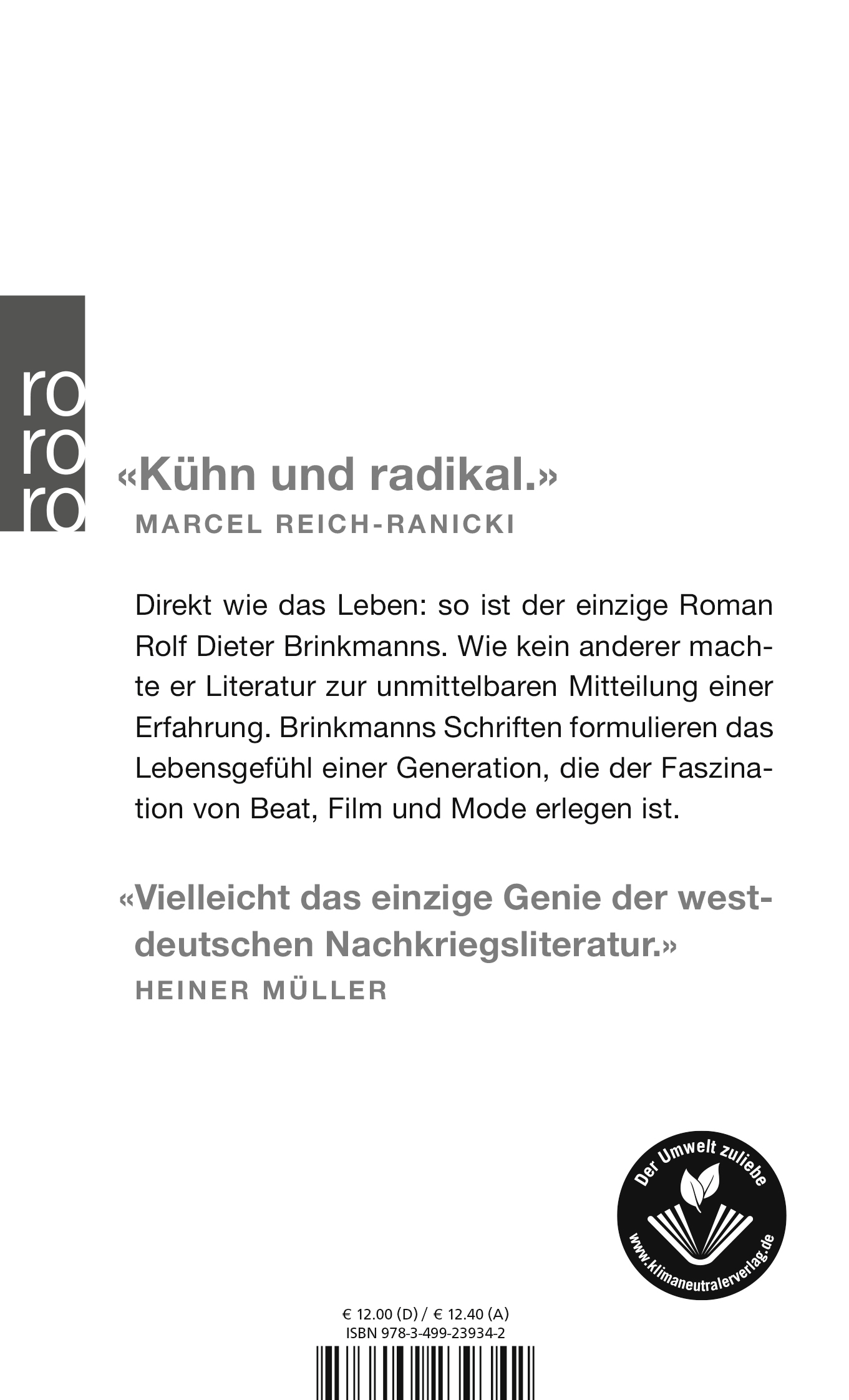 Unmittelbar wie das Leben: so ist der einzige Roman Rolf Dieter Brinkmanns. Wie kein anderer machte er Literatur zur unmittelbaren Mitteilung einer Erfahrung. Brinkmanns Romane formulieren das Lebensgefühl einer Generation, die der Faszination von Beat, Film und Mode erlegen ist.