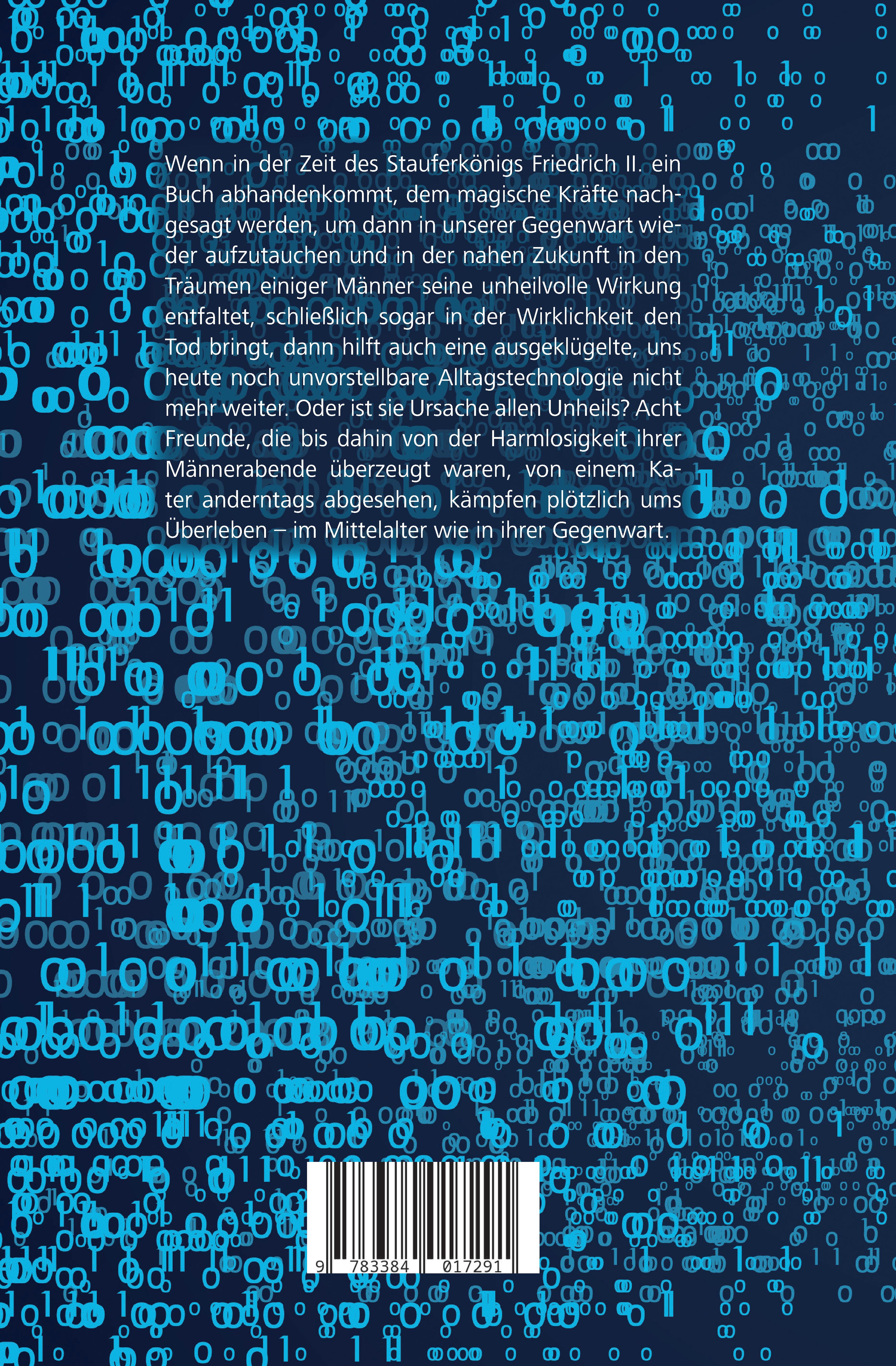 Wenn in der Zeit des Stauferkönigs Friedrich II. ein Buch abhandenkommt, dem magische Kräfte nachgesagt werden, um dann in unserer Gegenwart wieder aufzutauchen und in der nahen Zukunft in den Träumen einiger Männer seine unheilvolle Wirkung entfaltet, schließlich sogar in der Wirklichkeit den Tod bringt, dann hilft auch eine ausgeklügelte, uns heute noch unvorstellbare Alltagstechnologie nicht mehr weiter. Oder ist sie Ursache allen Unheils? Acht Freunde, die bis dahin von der Harmlosigkeit ihrer Männerabende überzeugt waren, von einem Kater anderntags abgesehen, kämpfen plötzlich ums Überleben - im Mittelalter wie in ihrer Gegenwart.