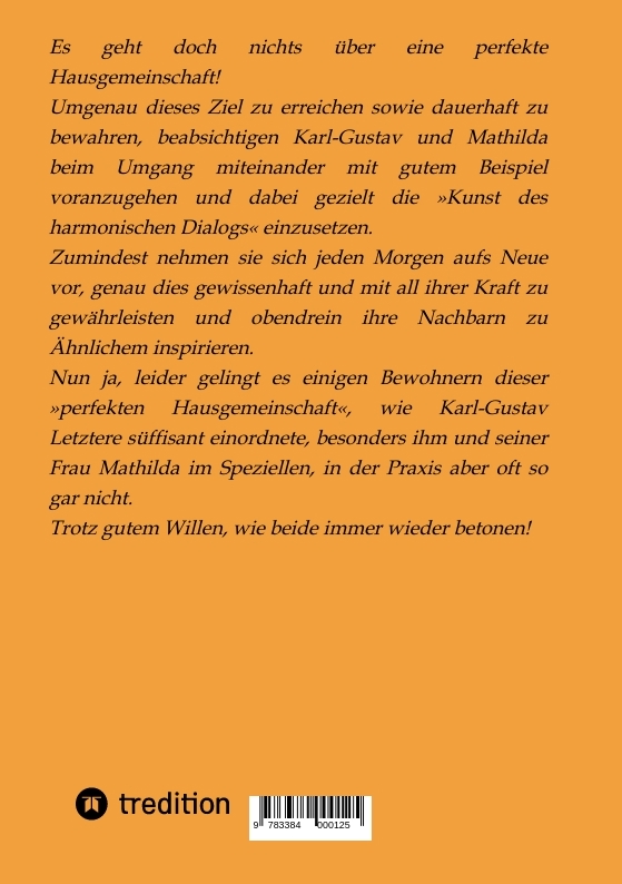 In dem dritten Band der Reihe »Unsere lieben Nachbarn« wird wiederum über das teils schwierige Zusammenleben einer Hausgemeinschaft berichtet, in der Mathilda und besonders Karl-Gustav eine prägende Stellung einnehmen. Die Überwindung der alltäglichen Probleme werden süffisant sowie gewürzt mit einem ordentlichen Schuss Satire, dabei im Besonderen die in dieser Hausgemeinschaft vielfach geführten - wenn auch teilweise etwas merkwürdig anmutenden - Dialoge dargestellt.Letzteres macht sich gravierend bemerkbar, wenn Karl-Gustav in einem Gespräch involviert ist. Und das, obwohl jener der Meinung ist, dass er sich stets um einen sinnvollen sowie zielorientierten und obendrein harmonischen Informationsaustausch bemüht!