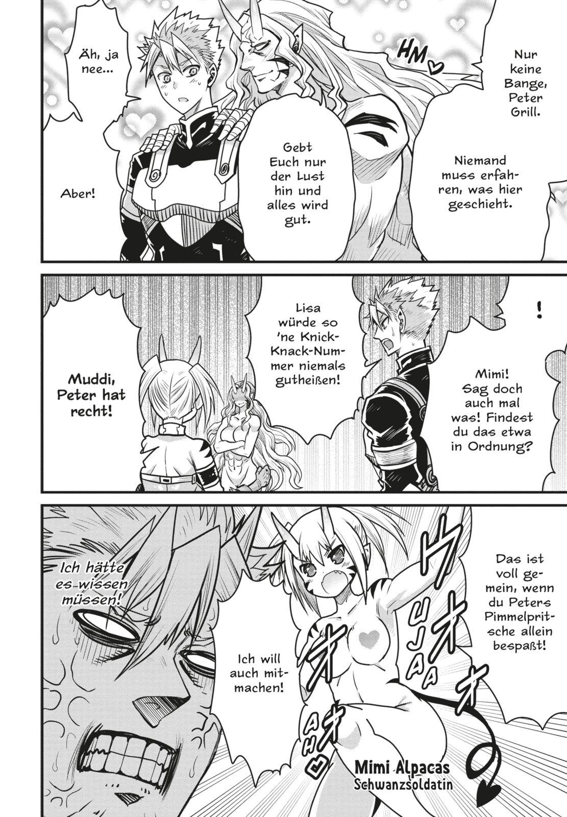 Peter steht von nun an zwischen den Fronten: Auf der einen Seite wartet seine Verlobte Luvelia, die immer noch annimmt, Babys würden von Störchen gebracht, auf der anderen Seite rotten sich Scharen wuschiger Monstermädchen zusammen, um das wohl begehrteste Erbgutgemisch des ganzen Reiches zu ergattern: Peters Spermien! Leider hat auch der stärkste Krieger eine Schwachstelle, und so erwacht Peter Grill immer wieder zwischen Oger-Damen, wohlig grinsenden Elfen und seinem schlechten Gewissen.