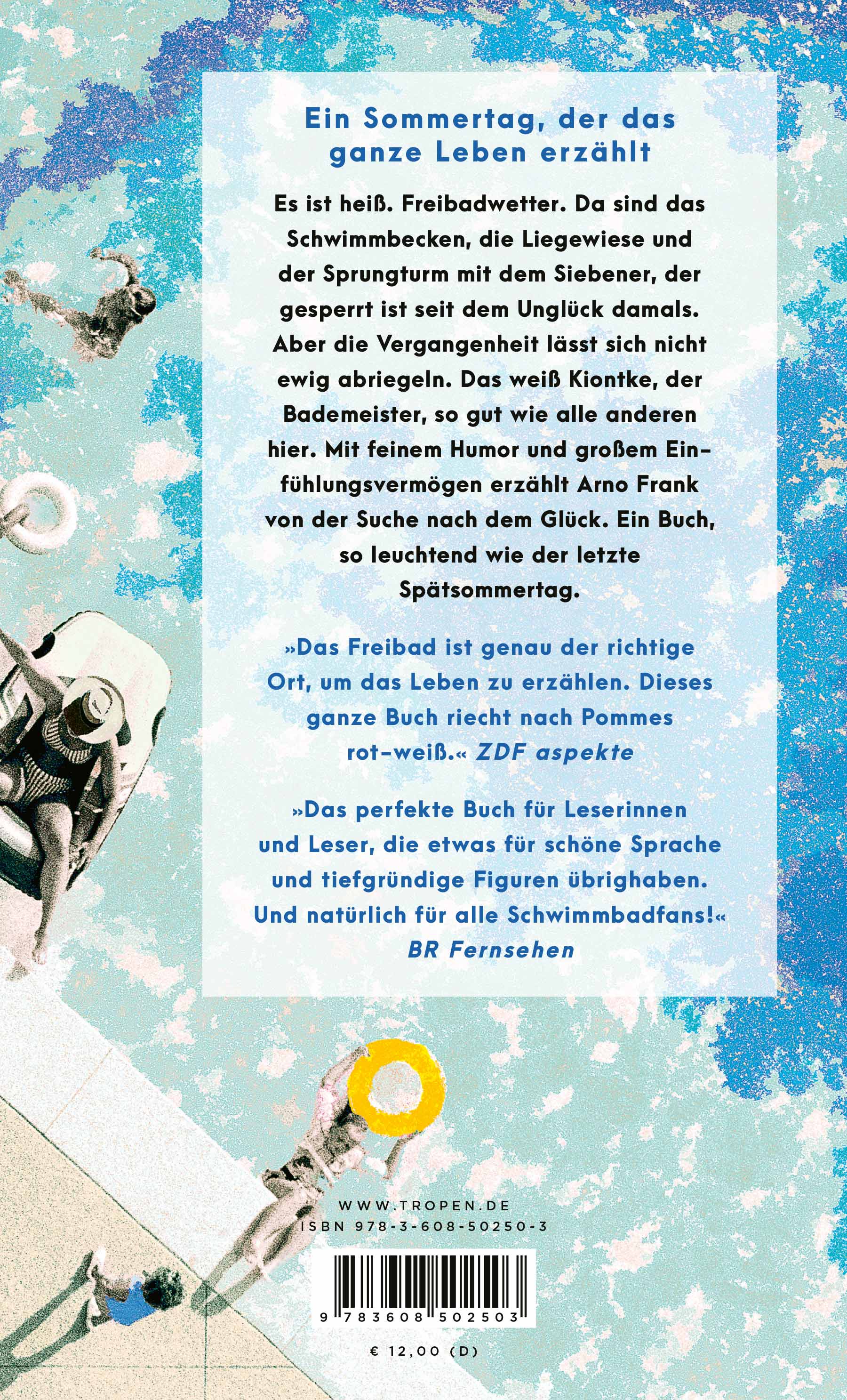 Ein Sommertag, der das ganze Leben erzählt. Es ist heiß. Freibadwetter. Da sind das Schwimmbecken, die Liegewiese und der Sprungturm mit dem Siebener, der gesperrt ist seit dem Unglück damals. Aber die Vergangenheit lässt sich nicht ewig abriegeln. Das weiß Kiontke, der Bademeister, so gut wie alle anderen hier. Wie Joe und Lenny, oder Isobel, die immer mehr im Gestern lebt. Für sie alle ist das Freibad ein Ort, der ihren Lebensweg bestimmt. Mit feinem Humor und großem Einfühlungsvermögen erzählt Arno Frank vom Weggehen und Zurückkommen, vom Bleiben und der Suche nach dem Glück. Ein Buch, so leuchtend wie der letzte Spätsommertag.