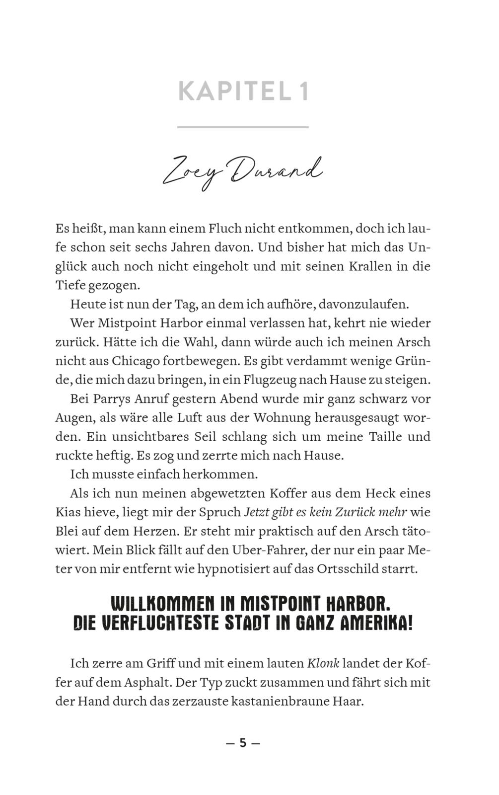 Nie wieder Mistpoint Harbour, das hat sich Zoey geschworen! Schließlich war ihr Leben dort die Hölle. Denn auf dem Küstenort liegt ein Fluch und alle geben Zoeys Familie die Schuld. Sechs Jahre hat sie sich ferngehalten, doch jetzt steckt ihr Bruder in Schwierigkeiten. Zoey muss ihm helfen - und dazu der einen Person gegenübertreten, die ihr verboten hat, zurückzukehren. Die ihr für eine kurze Zeit so nah war wie niemand sonst. Der Person, um die noch immer all ihre Gedanken kreisen: October Brambilla, Tochter der mächtigsten Familie der Stadt. Zoeys größter Crush, ihre größte Schwäche - und ganz bestimmt ihr Schicksal.