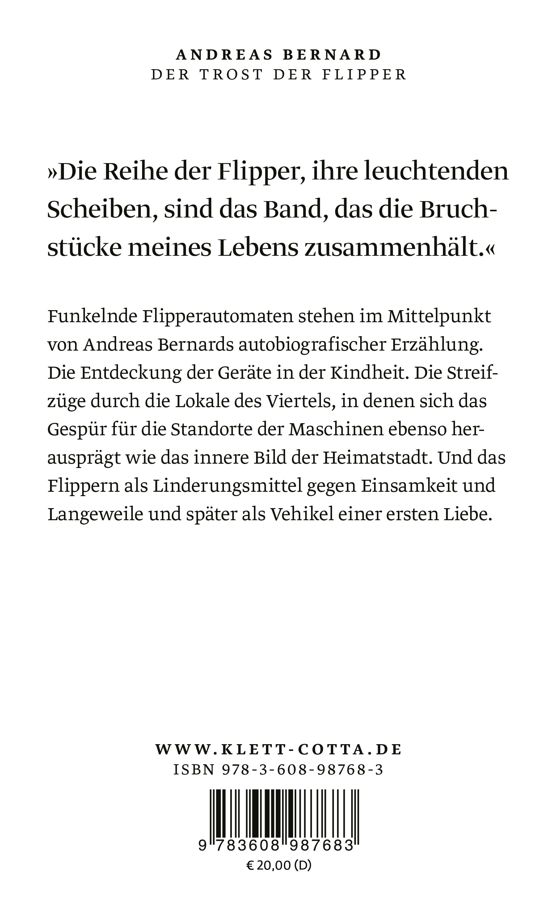 Funkelnde Flipperautomaten stehen im Mittelpunkt von Andreas Bernards autobiografischer Erzählung. Die Entdeckung der Geräte in der Kindheit. Die Streifzüge durch die Lokale des Viertels, in denen sich das Gespür für die Standorte der Maschinen ebenso herausprägt wie das innere Bild der Heimatstadt. Und das Flippern als Linderungsmittel gegen Einsamkeit und Langeweile und später als Vehikel einer ersten Liebe.