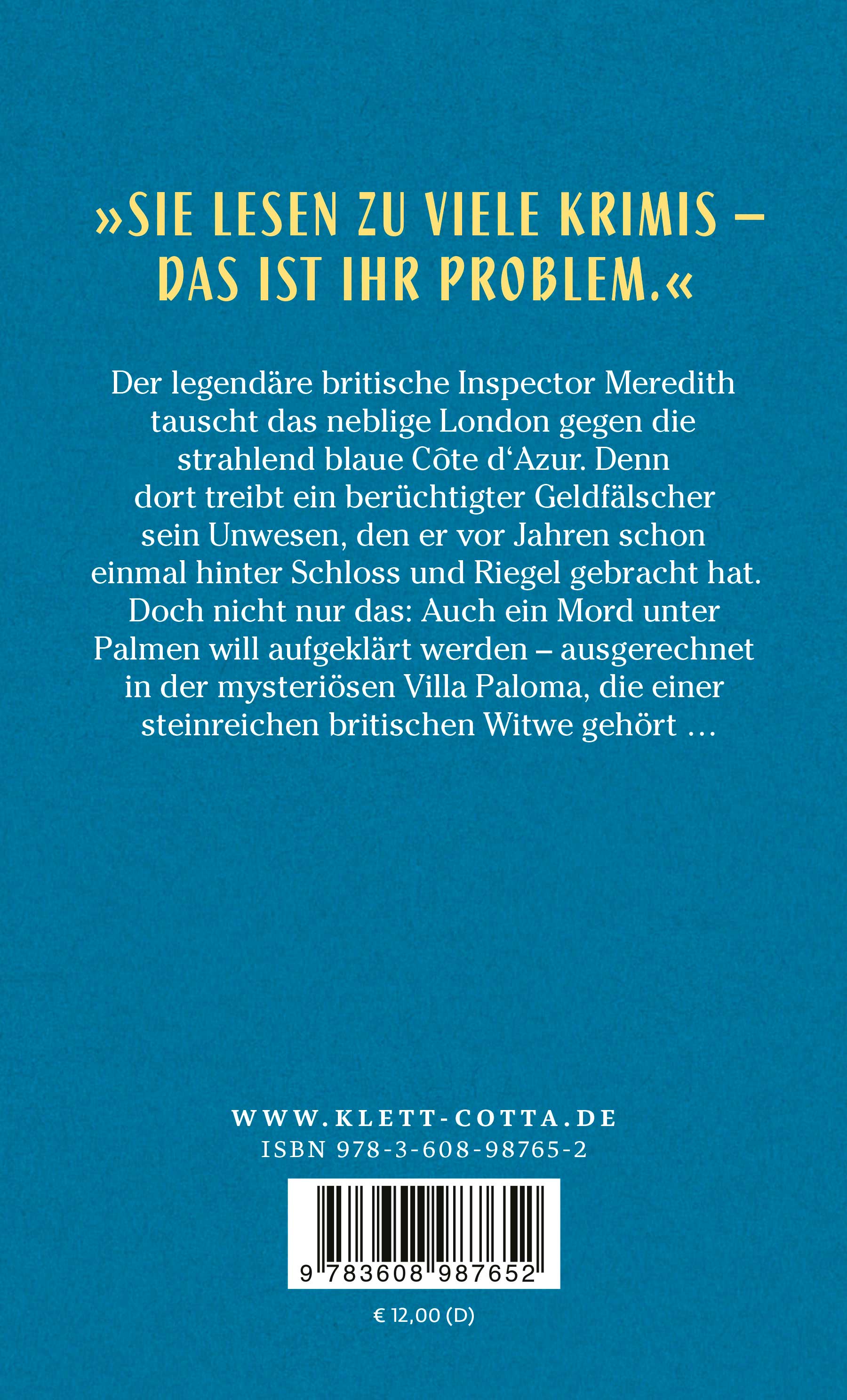 Der legendäre britische Inspector Meredith tauscht das neblige London gegen die strahlend blaue Côte d'Azur. Denn dort treibt ein berüchtigter Geldfälscher sein Unwesen, den er vor Jahren schon einmal hinter Schloss und Riegel gebracht hat. Doch nicht nur das: Auch ein Mord unter Palmen will aufgeklärt werden - ausgerechnet in der mysteriösen Villa Paloma, die einer steinreichen britischen Witwe gehört ...