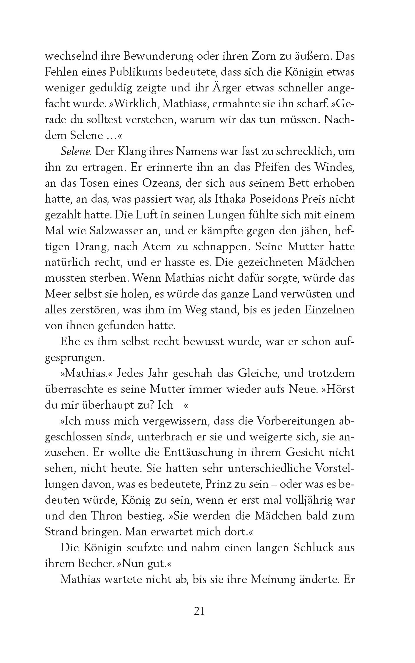 Der Prinz räusperte sich. Seine warme, sonnengebräunte Haut war nass von Schweiß, der ihm die Locken an die Stirn klebte und ihn in der Sonne wie Bronze glänzen ließ. Sein Blick huschte immer wieder zu Letos Gesicht. Für einen jämmerlichen Feigling, der sein Volk in den Betten verhungern ließ, war er schändlich schön, wie ein Porträt mit harten Linien und glatter Haut, mit Augen, Brauen und Lippen in anbetungswürdigen Bögen aus Zeichenkohle. Seine Stimme war, als er sprach, trotz des Zitterns weich und melodisch. »Wenn ihr aus diesem Leben scheidet, so möge euer Körper sein wie die Wellen, mögen eure Knochen sein wie der Sand, mögen eure Seelen frei fliegen wie die Möwen und über uns wachen. O großer Poseidon, nimm dieses Opfer an.« Beim letzten Wort brach seine Stimme. Dann sagte er: »Es tut mir so leid.« Ein gedämpftes Raunen der Wachen verriet Leto, dass dies nicht zur vorbereiteten Rede gehörte. »Wenn ich irgendetwas tun könnte …« Er brach ab. Seine Augen, immer noch auf Leto gerichtet, waren groß und flehend. Sie hätte ihm beinahe vergeben können. Doch im letzten Moment, als er das Kinn mit einem widerstrebenden Nicken senkte und seine Wache das Schwert hob und es in einem glitzernden Bogen auf die Seile herabsausen ließ, die die Bretter unter ihr hielten, schaute der Prinz weg. Feigling.