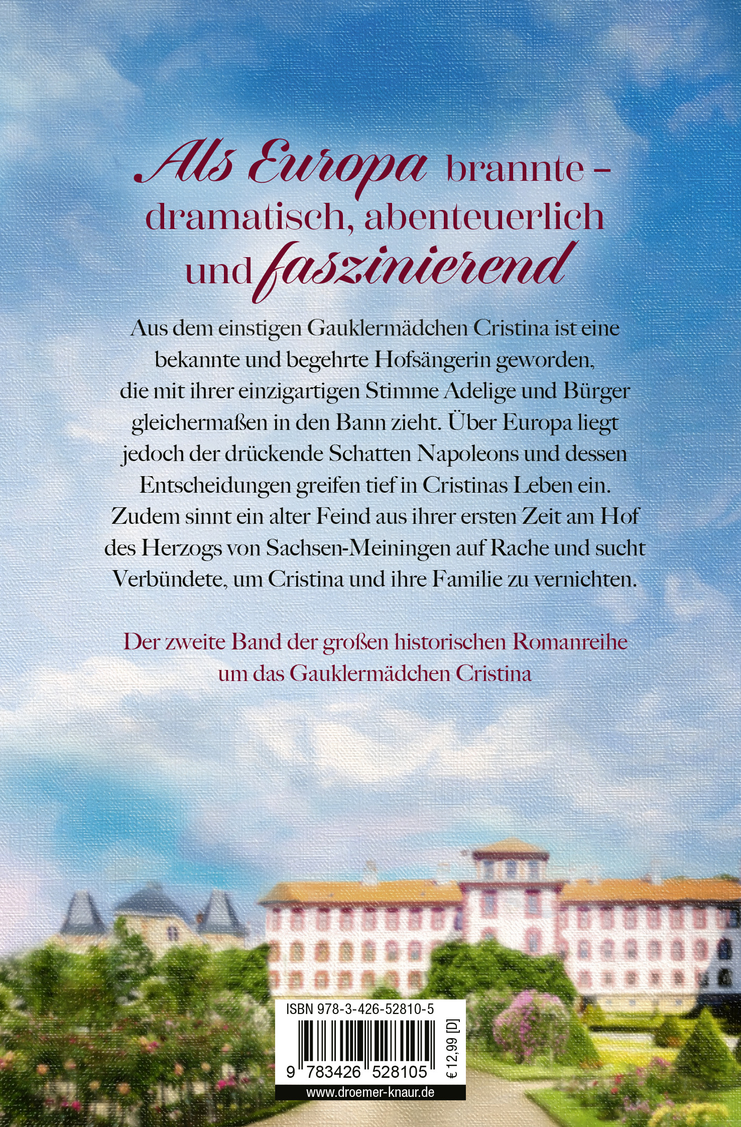 Aus dem einstigen Gauklermädchen Cristina ist eine bekannte und begehrte Hofsängerin geworden, die die mit ihrer einzigartigen Stimme Adelige und Bürger gleichermaßen in den Bann zieht. Über Europa liegt jedoch der drückende Schatten Napoleons und dessen Entscheidungen greifen tief in Cristinas Leben ein. Zudem sinnt ein alter Feind aus ihrer ersten Zeit am Hofe des Herzogs von Sachsen-Meiningen auf Rache und sucht Verbündete, um Cristina und ihre Familie zu vernichten. Mit viel Herzblut und Liebe zu historischen Details erweckt Bestseller-Autorin Iny Lorentz mit einem dramatisch-spannenden Frauenschicksal die Zeit der Napoleonischen Kriege zum Leben und lässt uns mit ihrer Heldin Cristina mitfiebern, bangen und hoffen.