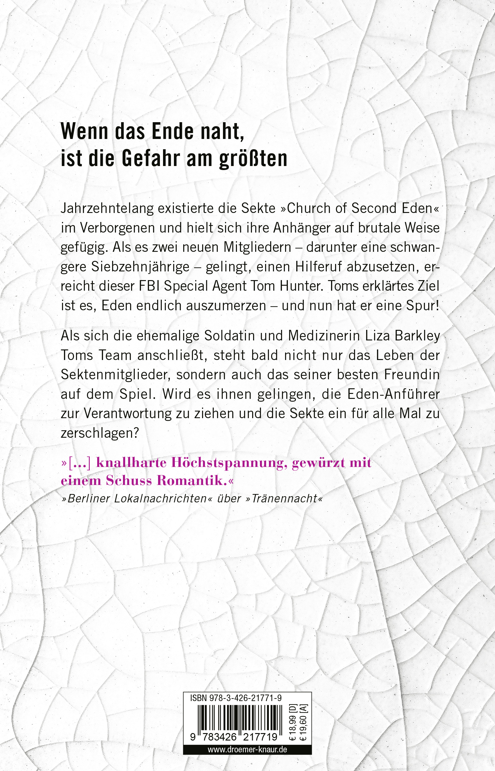 Währenddessen wird FBI Special Agent Tom Hunter, einem Freund und Kollegen von Gideon, der Hilferuf zweier Teenager zugespielt, die kürzlich zur Sekte verschleppt wurden. Zusammen mit der ehemaligen Soldatin und Ärztin Liza Barkley, die schon lange Gefühle für den verschlossenen Tom hegt, nehmen die Agents den finalen Kampf gegen Eden auf. Die Zeit läuft ihnen davon, denn es steht auch das Leben einer Schwangeren und ihres ungeborenen Kindes auf dem Spiel ...