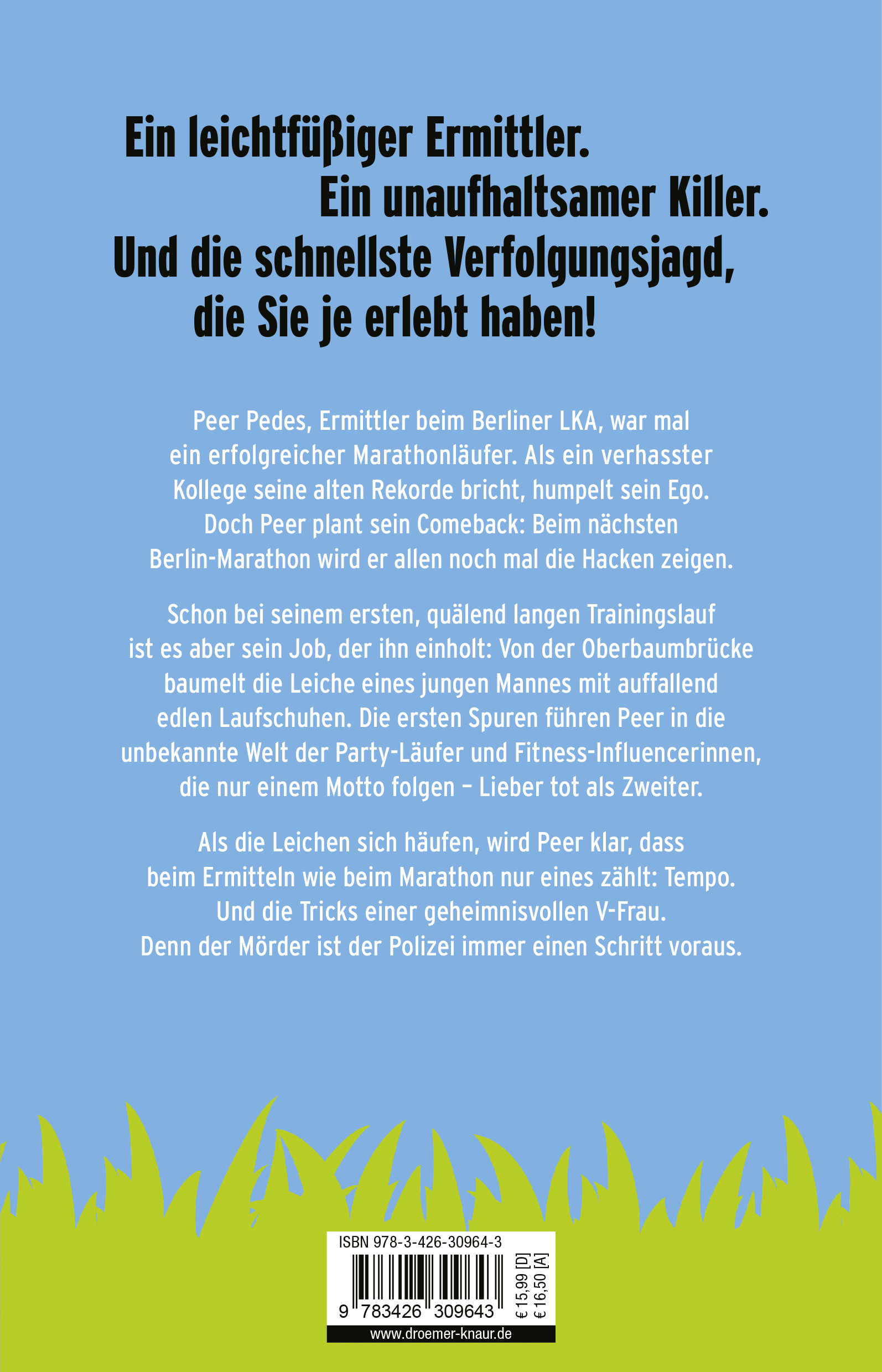 Peer Pedes, Ermittler beim Berliner LKA, war mal ein begabter Marathonläufer. Als ein verhasster Kollege seine alten Rekorde bricht, humpelt sein Ego mehr denn je, und er will allen wieder die Hacken zeigen. Er wird beim Berlin-Marathon mitmachen - und gewinnen!