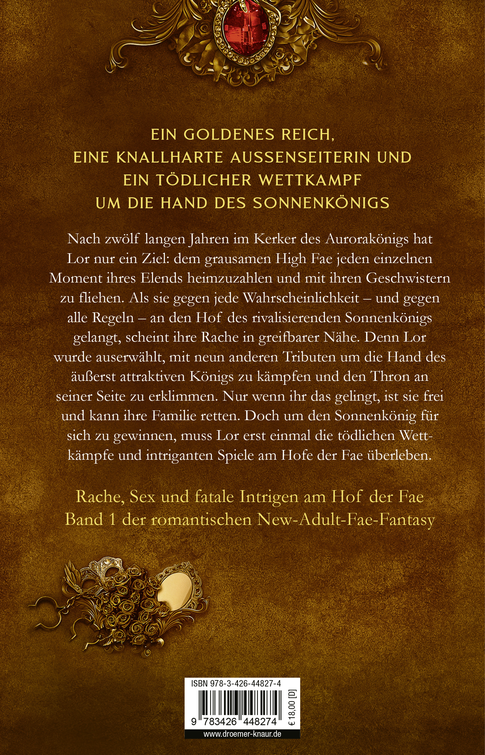 Nach zwölf langen Jahren im Kerker des Aurorakönigs hat Lor nur ein Ziel: dem grausamen High Fae jeden einzelnen Moment ihres Elends heimzuzahlen und mit ihren Geschwistern zu fliehen. Als sie gegen jede Wahrscheinlichkeit - und gegen alle Regeln - an den Hof des rivalisierenden Sonnenkönigs gelangt, scheint ihre Rache in greifbarer Nähe. Denn Lor wurde auserwählt mit neun anderen Tributen um die Hand des äußerst attraktiven Königs zu kämpfen und den Thron an seiner Seite zu erklimmen. Nur wenn ihr das gelingt, ist sie frei und kann ihre Familie retten. Doch um den Sonnenkönig für sich zu gewinnen, muss Lor erst einmal die tödlichen Wettkämpfe und intriganten Spiele am Hofe der Fae überleben.