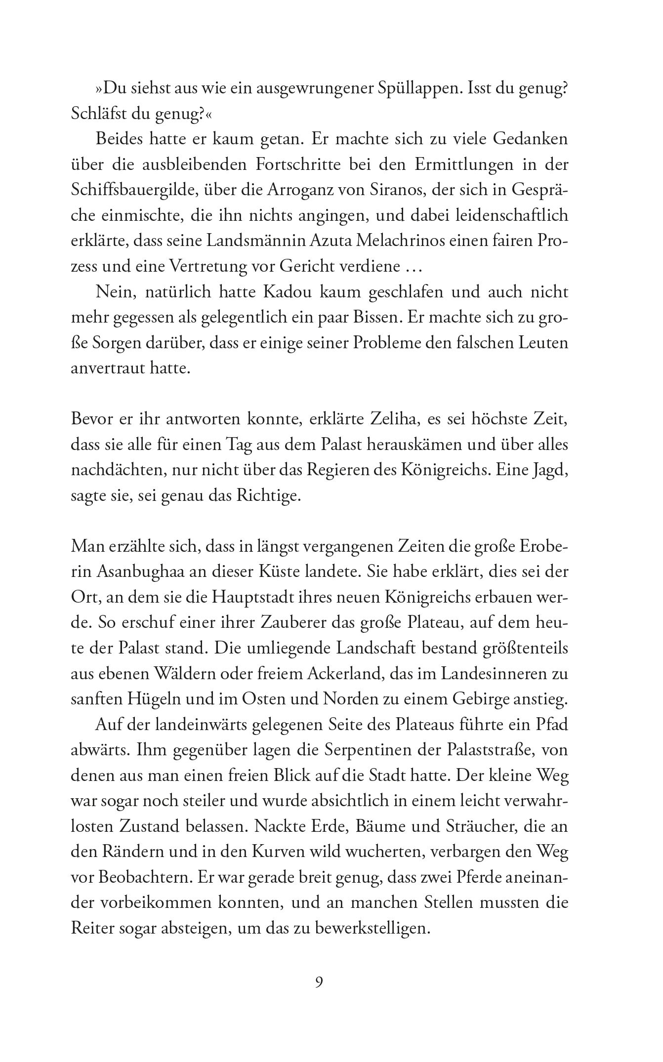 Die Kommandantin blieb vor einer Doppeltür aus mit Schnitzereien versehenem Mahagoni stehen. »Hör zu«, flüsterte sie. »Für eine Leibwache ist er keine schwierige Herausforderung. Er ist sehr still und bleibt gerne für sich. Ich kannte ihn schon, bevor er laufen gelernt hat. Und er hat sich immer sehr anständig benommen. Verstehst du?« Oh nein. Evemer war sich jetzt sicher, wem er zugewiesen wurde. »Kommandantin«, sagte er mit leicht erstickter Stimme. Sie nickte knapp und klopfte an die Tür, bevor sie sie einen Spalt breit öffnete. »Verzeihung, Eure Hoheit. Hoșkadem ist hier. Darf ich euch miteinander bekannt machen?« Hoheit. Der Prinz. Verdammt. Ein längeres Schweigen folgte. »Ja«, erklang schließlich eine müde Stimme aus dem Inneren. »Wenn er möchte, kann er hereinkommen.« Eozena nickte energisch und drückte die Tür ganz auf, dann bedeutete sie Evemer voranzugehen. Er sah die Kommandantin an. Er sah die Tür an. Er sah die Kommandantin an. Sie musterte ihn mit einer hochgezogenen Braue, und das war der furchterregendste Gesichtsausdruck, den er sich überhaupt vorstellen konnte. Also betrat er den Raum. Er war genauso prachtvoll wie der Rest des Goldhofs. Die gewölbte Decke war mit einem Muster aus zarten Ranken und Blumen bemalt, was wie feinste Spitze wirkte. Teppiche in kräftigen Farben bedeckten den Boden, und die Fenster standen weit offen, während Vorhänge in der Frühlingsbrise flatterten. In der Mitte des Salons befand sich ein niedriger Tisch, auf dem ein Frühstück wartete, das noch nicht angerührt worden war. Auf der gegenüberliegenden Seite des Tischs saß der Prinz, der dieses Frühstück unbeachtet gelassen hatte. Der Prinz war nur zwei oder drei Jahre jünger als Evemer und in jeder Hinsicht kleiner und zierlicher als er. Die Hände, in denen Kadou eine volle Tasse hielt, über der kein Dampf aufstieg, waren schlank und gepflegt. Das tintenschwarze Haar ergoss sich lang und glänzend in Wellen und weichen Locken bis zu den Ellbogen, und er hatte große Augen, die wie die blauschwarze Farbe des Ozeans in einer dunklen Nacht leuchteten.