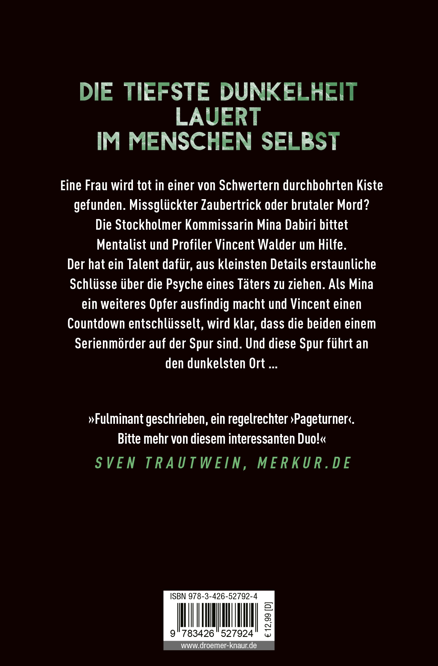 Wer ermordet eine Frau, indem er sie in eine Kiste sperrt und mit mehreren Schwertern durchbohrt? Weil der Fall an einen grausam missglückten Zaubertrick erinnert, zieht die Stockholmer Kommissarin Mina Dabiri den Profiler Vincent Walder hinzu, der selbst als Mentalist auftritt. Doch wie Mina kommt auch Vincent mit Menschen nicht sonderlich gut zurecht. Erst als eine weitere Leiche auftaucht und Vincent einen Code entschlüsselt, der auf einen Countdown hindeutet, beginnen Mina und er einander zu vertrauen - und die beiden müssen feststellen, dass ihre eigenen dunklen Geheimnisse im Zentrum des Falls stehen.