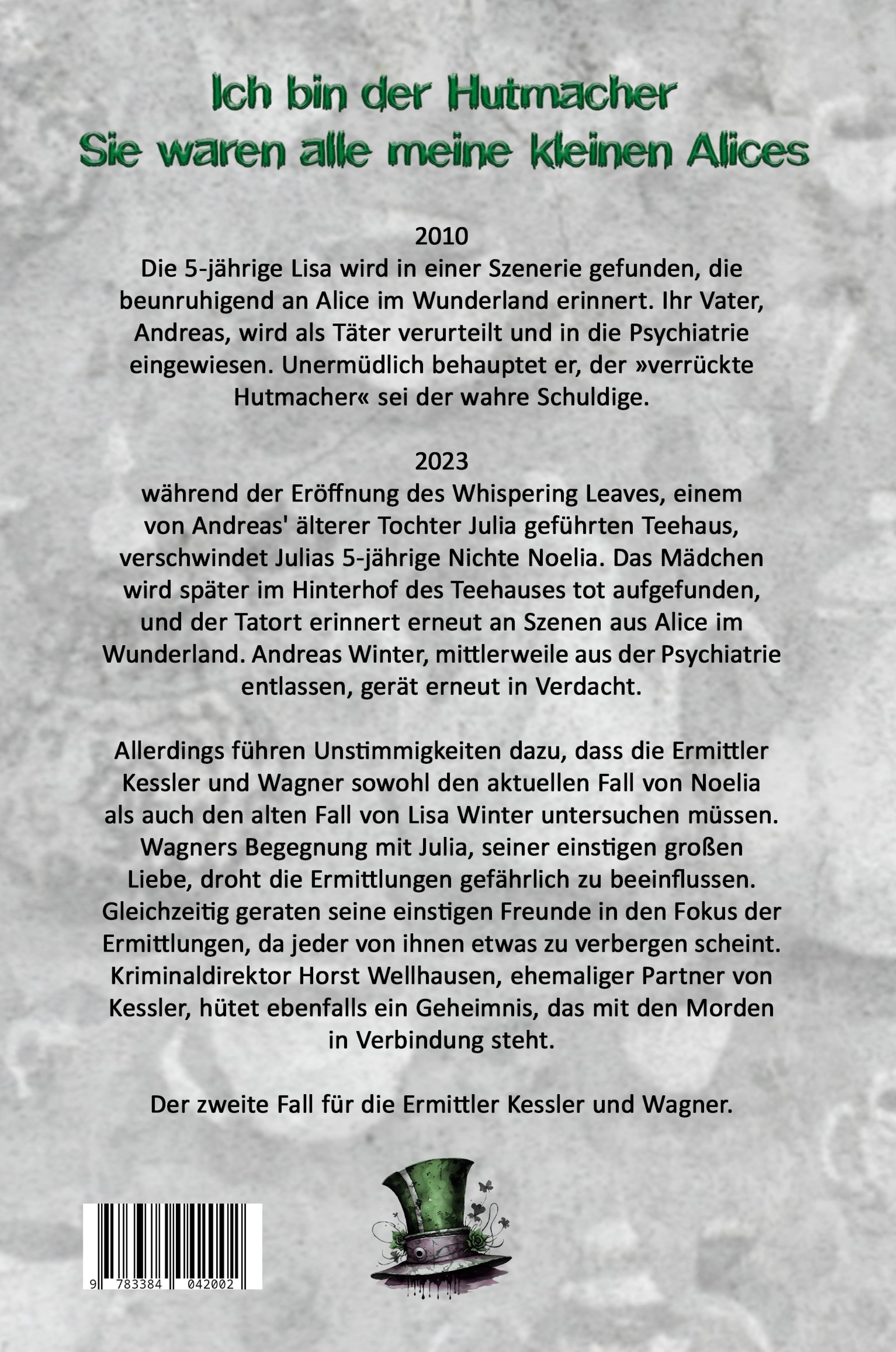 2010Die 5-jährige Lisa wird in einer Szenerie gefunden, die beunruhigend an Alice im Wunderland erinnert. Ihr Vater, Andreas, wird als Täter verurteilt und in die Psychiatrie eingewiesen. Unermüdlich behauptet er, der »verrückte Hutmacher« sei der wahre Schuldige.2023während der Eröffnung des Whispering Leaves, einem von Andreas' älterer Tochter Julia geführten Teehaus, verschwindet Julias 5-jährige Nichte Noelia. Das Mädchen wird später im Hinterhof des Teehauses tot aufgefunden, und der Tatort erinnert erneut an Szenen aus Alice im Wunderland. Andreas Winter, mittlerweile aus der Psychiatrie entlassen, gerät erneut in Verdacht.Allerdings führen Unstimmigkeiten dazu, dass die Ermittler Kessler und Wagner sowohl den aktuellen Fall von Noelia als auch den alten Fall von Lisa Winter untersuchen müssen. Wagners Begegnung mit Julia, seiner einstigen großen Liebe, droht die Ermittlungen gefährlich zu beeinflussen. Gleichzeitig geraten seine einstigen Freunde in den Fokus der Ermittlungen, da jeder von ihnen etwas zu verbergen scheint. Kriminaldirektor Horst Wellhausen, ehemaliger Partner von Kessler, hütet ebenfalls ein Geheimnis, das mit den Morden in Verbindung steht.Der zweite Fall für die Ermittler Kessler und Wagner.