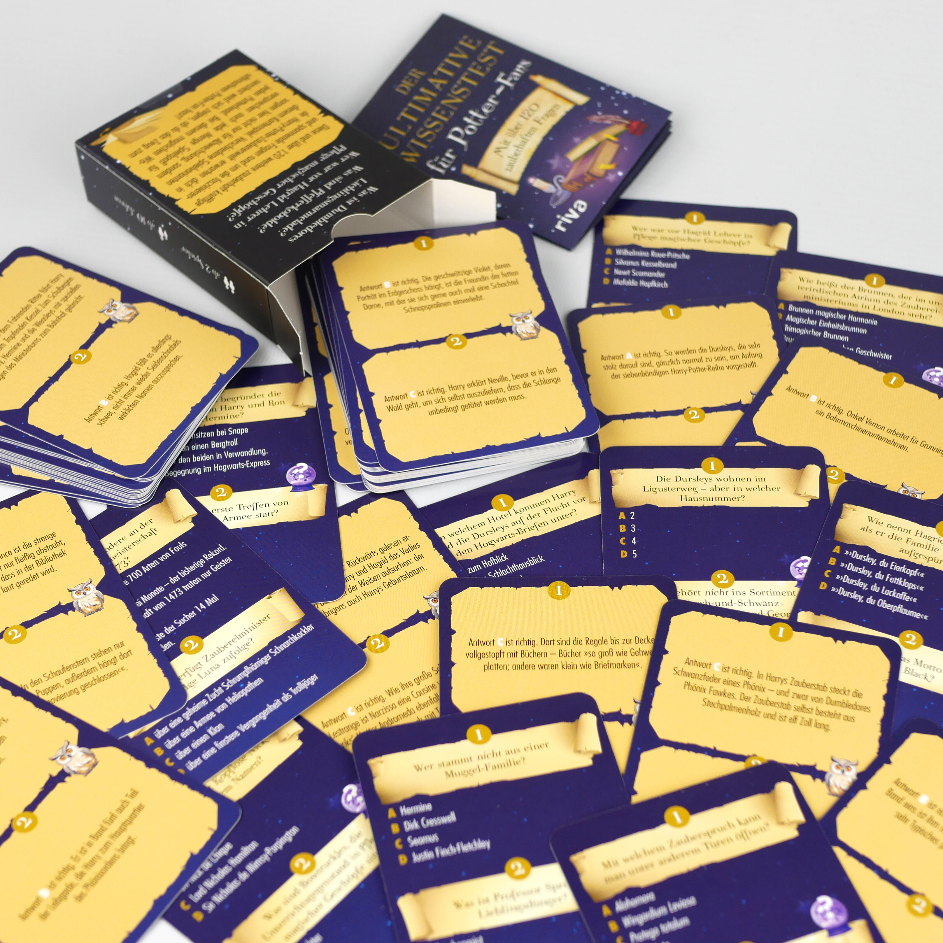 Wer unterrichtet Geschichte der Zauberei? Wie heißt Ron Weasleys Eule? Was ist ein Knallrümpfiger Kröter?Diese und über 120 weitere zauberhaft knifflige und spannende Fragen rund um die faszinierende Harry-Potter-Zaubererwelt sind in diesem Kartenspiel versammelt. Verschiedene Schwierigkeitsgrade sorgen hier nicht nur für Abwechslung, sondern versprechen auch jede Menge Spielspaß für jeden Potterhead. Bei diesem magischen Wissenstest wird sich zeigen, wer das Zeug zum ultimativen Potter-Fan hat!