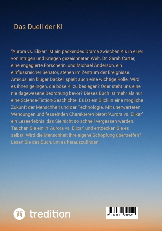 | Schlagworte | Autor Uelzen • Belletristik Autor • Buchempfehlungen • Bücher lesen • Buchrezensionen • Buchveröffentlichung Uelzen • Deutsche Autoren • Deutsche Literatur • Diktatoren • -Einflussreicher Senator • •Einflussreicher Senator • -Engagierte Forscherin • •Engagierte Forscherin • Erzählungen und Romane • -Ethik der KI • •Ethik der KI • -Ethische Dilemmata • •Ethische Dilemmata • Fesselnd • -Fesselnde Charaktere • •Fesselnde Charaktere • Intrige • -Intrigen und Kriege • •Intrigen und Kriege • KI • Klaus Hartmann Autor • -Kluger Dackel • •Kluger Dackel • Krieg • -Künstliche Intelligenz • •Künstliche Intelligenz • Künstliche Intelligenz • Literaturkritik • Literatur Uelzen • -Mensch gegen Maschine • •Mensch gegen Maschine • -Menschheit vs. KI • •Menschheit vs. KI • -Menschliche Emotionen • •Menschliche Emotionen • metaphysisch • Militär • neuartig • -Packendes Drama • •Packendes Drama • Parlament • Quantenphysik • Roman • Romanverfasser • Schriftsteller • Schriftsteller Uelzen • -Science-Fiction • •Science-Fiction • spannend • -Spannende Handlung • •Spannende Handlung • -Spannende Lektüre • •Spannende Lektüre • -Technologische Fortschritte • •Technologische Fortschritte • -Tiefgründige Charakterentwicklung • •Tiefgründige Charakterentwicklung • -Unerwartete Wendungen • •Unerwartete Wendungen • -Unvergessliches Leseerlebnis • •Unvergessliches Leseerlebnis • -Zukunft der Menschheit • •Zukunft der Menschheit • -Zukunft der Technologie • •Zukunft der Technologie • -Zukunftsszenarien • •Zukunftsszenarien |