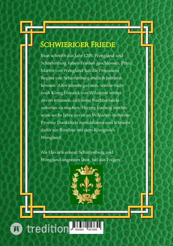 Schwieriger Friede ist die Fortsetzung des Romans "Martin von Wengland" aus der Reihe "Chroniken der Verborgenen Lande". Prinz Martin von Wengland hat maßgeblich zum Frieden zwischen Wengland und Scharfenburg beitragen können. Er und Prinzessin Regina von Scharfenburg haben endlich geheiratet, und Martin ist als Gesandter seines Vaters König Rudolf in Scharfenburg. Herzog Ludwig sieht in dem Frieden die Chance, auch die sechs Jahre zuvor an Wilzarien verlorene Provinz Dunkelfels zurückzuerlangen. Martin kann Ludwig davon überzeugen, ein neues Rekrutierungssystem einzuführen, das er bereits ausprobiert hat. Die Maßnahme kommt nicht viel zu früh, denn König Havarik von Wilzarien will den von ihm selbst angezettelten Krieg noch nicht verloren geben. Um doch noch zu gewinnen und die Verborgenen Lande unter seine Herrschaft zu bekommen, scheut er weder Hinterlist noch einen neuen Angriffskrieg.
