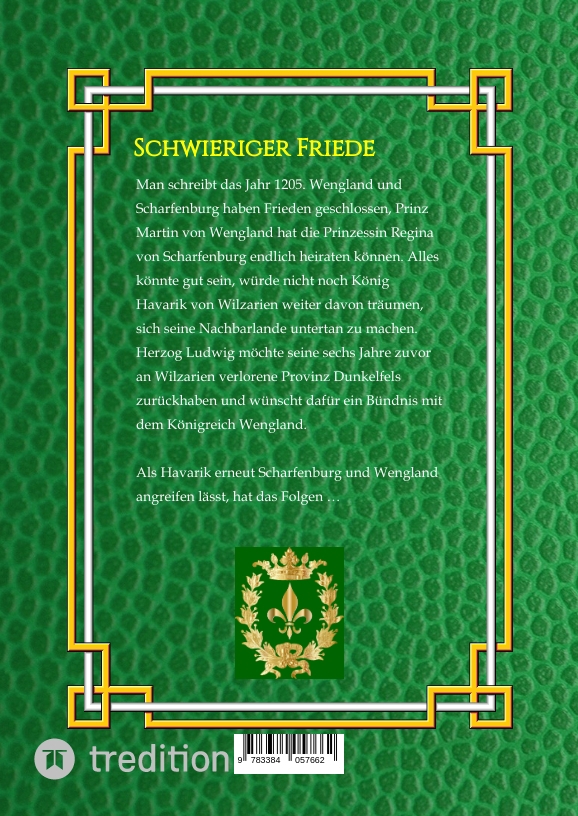 Schwieriger Friede ist die Fortsetzung des Romans "Martin von Wengland" aus der Reihe "Chroniken der Verborgenen Lande". Prinz Martin von Wengland hat maßgeblich zum Frieden zwischen Wengland und Scharfenburg beitragen können. Er und Prinzessin Regina von Scharfenburg haben endlich geheiratet, und Martin ist als Gesandter seines Vaters König Rudolf in Scharfenburg. Herzog Ludwig sieht in dem Frieden die Chance, auch die sechs Jahre zuvor an Wilzarien verlorene Provinz Dunkelfels zurückzuerlangen. Martin kann Ludwig davon überzeugen, ein neues Rekrutierungssystem einzuführen, das er bereits ausprobiert hat. Die Maßnahme kommt nicht viel zu früh, denn König Havarik von Wilzarien will den von ihm selbst angezettelten Krieg noch nicht verloren geben. Um doch noch zu gewinnen und die Verborgenen Lande unter seine Herrschaft zu bekommen, scheut er weder Hinterlist noch einen neuen Angriffskrieg.