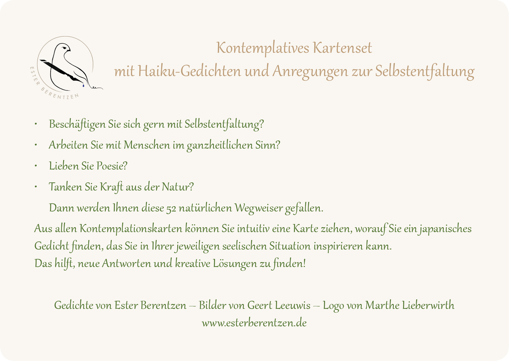 Ein Kartenset zum Innehalten, um zur Ruhe zu kommen und spielerisch Lösungen für die Fragen des Alltags zu erhalten: Die „natürlichen Wegweiser“ von Ester Berentzen sind ein Geschenk – für alle, die für einen Moment eine Auszeit benötigen.